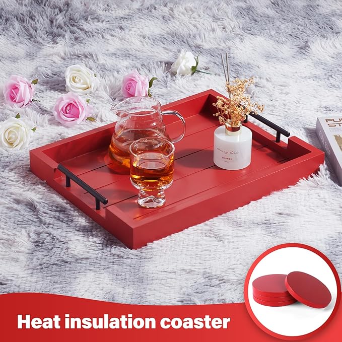 Coffee Table Decorative Serving Tray - 17x13 Inch Wood Tray with 4 Wooden Coasters - Ideal for Ottoman, Breakfast