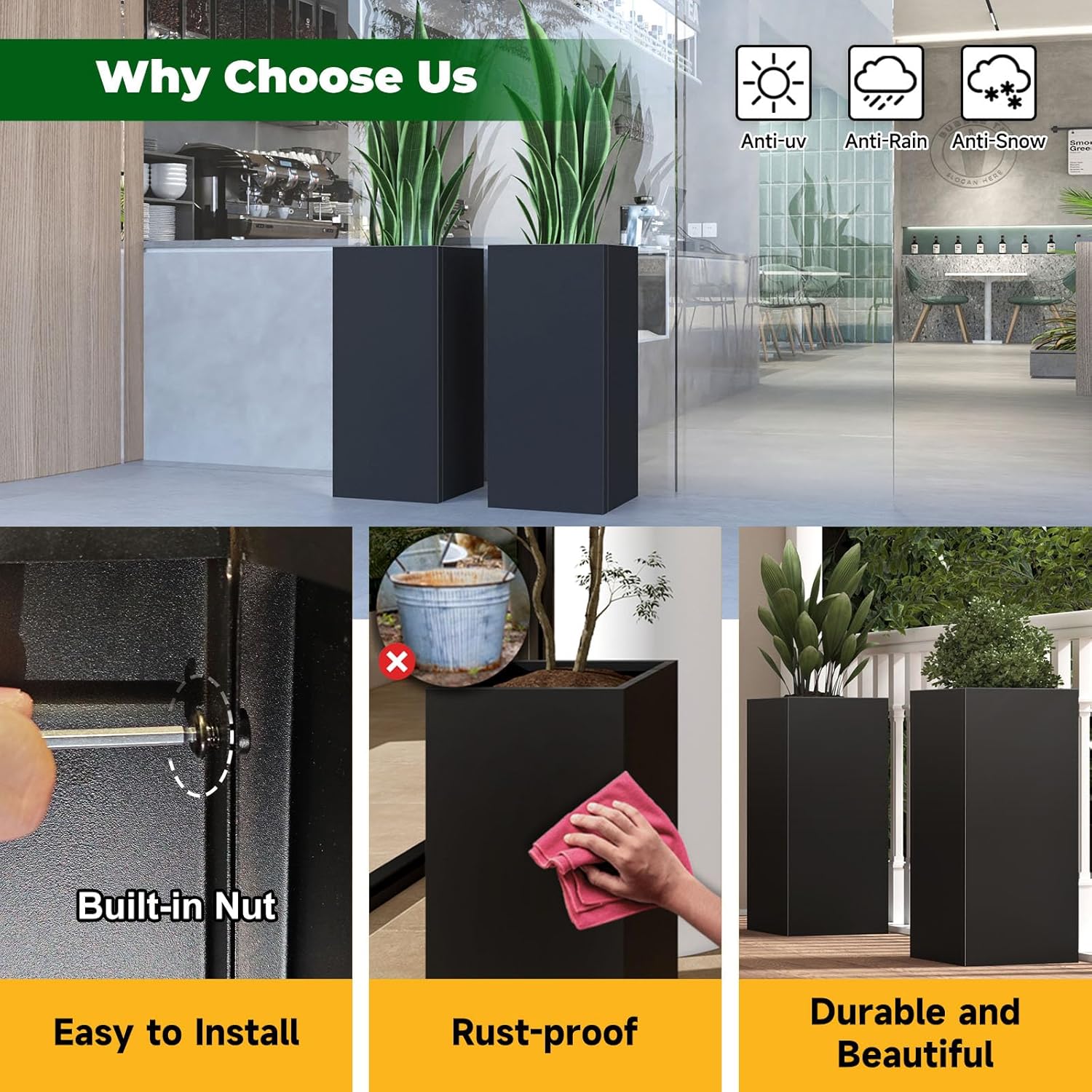 • WIDELY APPLICABLE - The black sleek metallic finish adds a touch of modern sophistication to any space, whether it's your garden, patio or living room.This tall rectangular flowerpot serves as a beautiful accent.