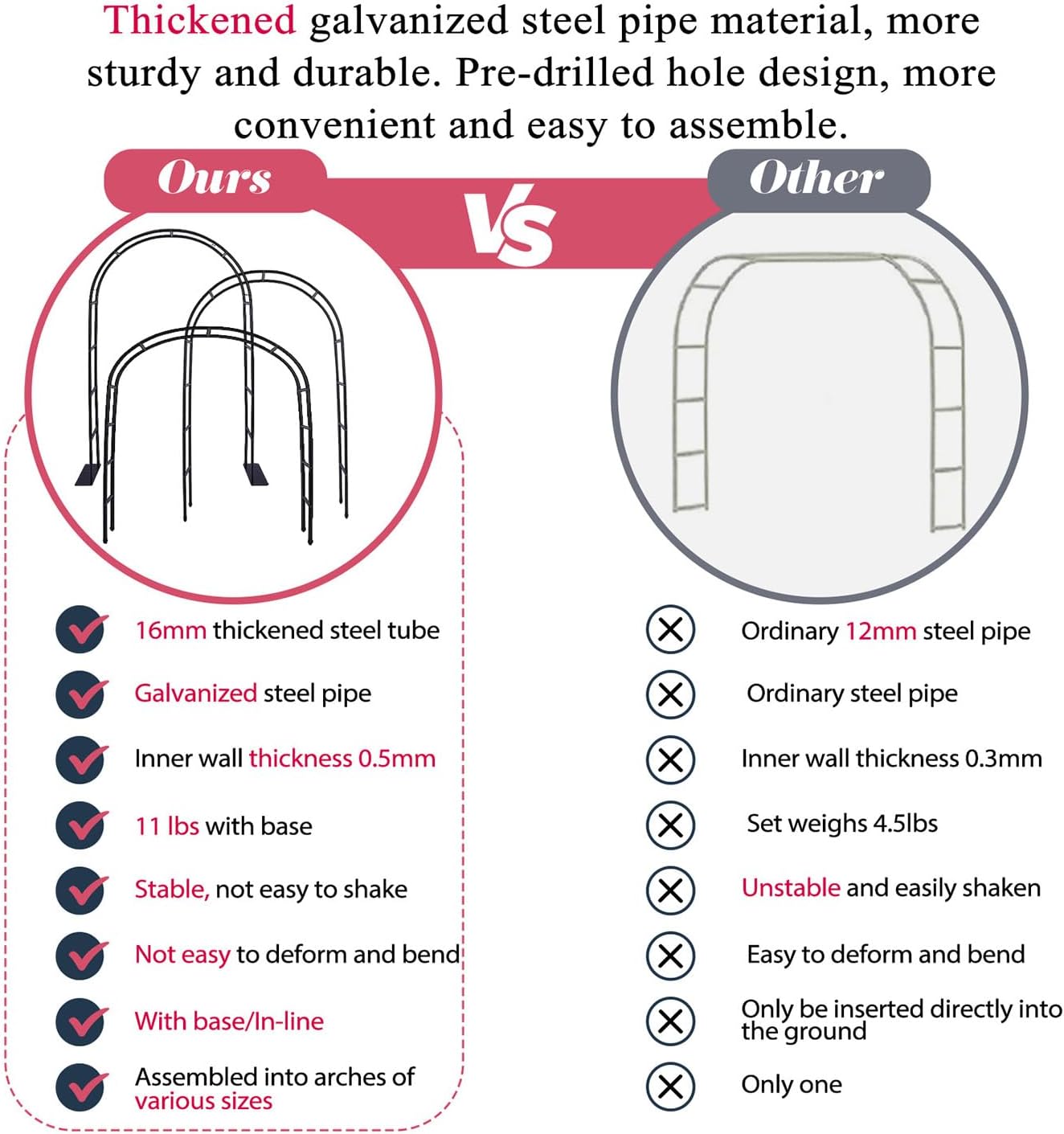 • STURDY MATERIAL: Made of better quality; tougher and rust-proof galvanized steel tubes. The inner wall of the steel pipe is thickened to 0.5 mm; which is twice as heavy as the ordinary products and not easy to bend; deform and tilt. Can be used for wedding arch; garden arch trellis; garden arbor