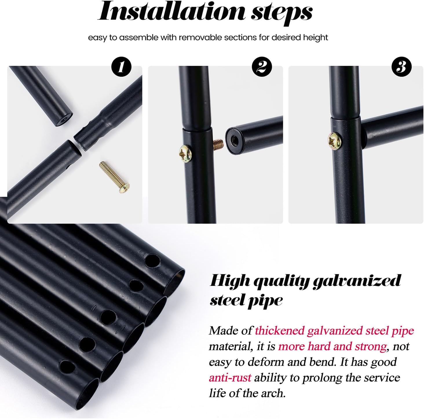 • STURDY MATERIAL: Made of better quality; tougher and rust-proof galvanized steel tubes. The inner wall of the steel pipe is thickened to 0.5 mm; which is twice as heavy as the ordinary products and not easy to bend; deform and tilt. Can be used for wedding arch; garden arch trellis; garden arbor