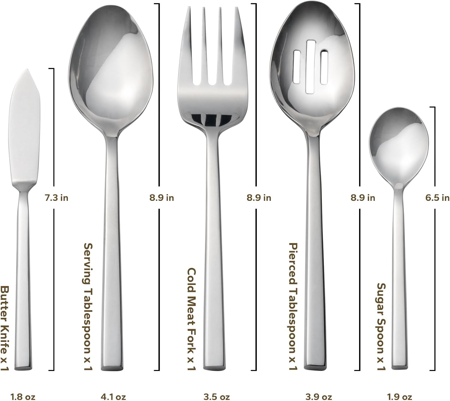 • INLUDES: 45-piece flatware set with service for 8. Includes 8 each: dinner knife, dinner fork, salad fork, dinner spoon and teaspoon. Plus 1 each:serving tablespoon, pierced tablespoon, cold meat fork, butter knife, and sugar spoon