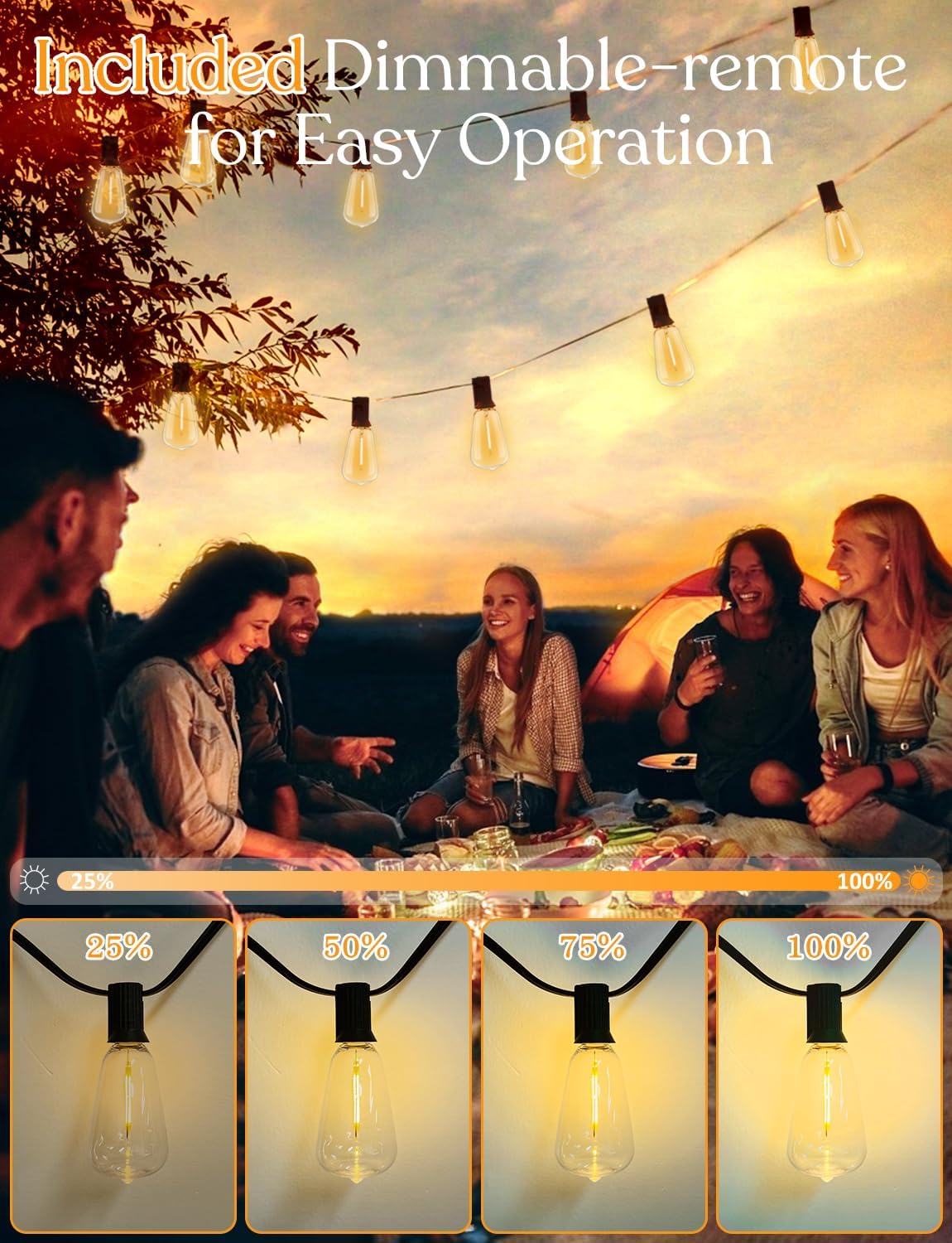 • Vintage-style LED String Lights - Transform your outdoor space into a cozy and inviting haven with these vintage-style ST38 string lights. With 2,500K warm color technology, these bulbs emit a soft golden glow. Use the included dimmer and remote control for customizable lighting and create a wonderful ambiance for any occasion. Whether you're entertaining guests or enjoying a quiet evening outside, our outdoor string lights will transport you to a warm and inviting outdoor sanctuary.