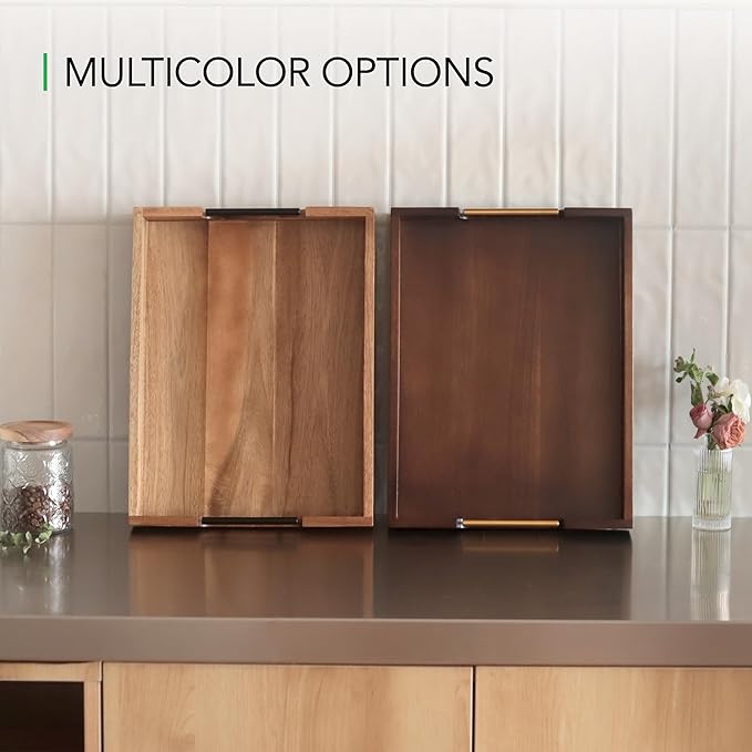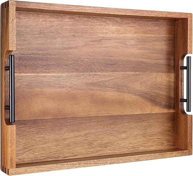 • Sleek and Functional Serving Tray: At 16.7 x 12.8 inch, this serving tray features metal handles for easy carrying; Its rich wood grain texture creates a harmonious aesthetic, making it a thoughtful and practical contribution