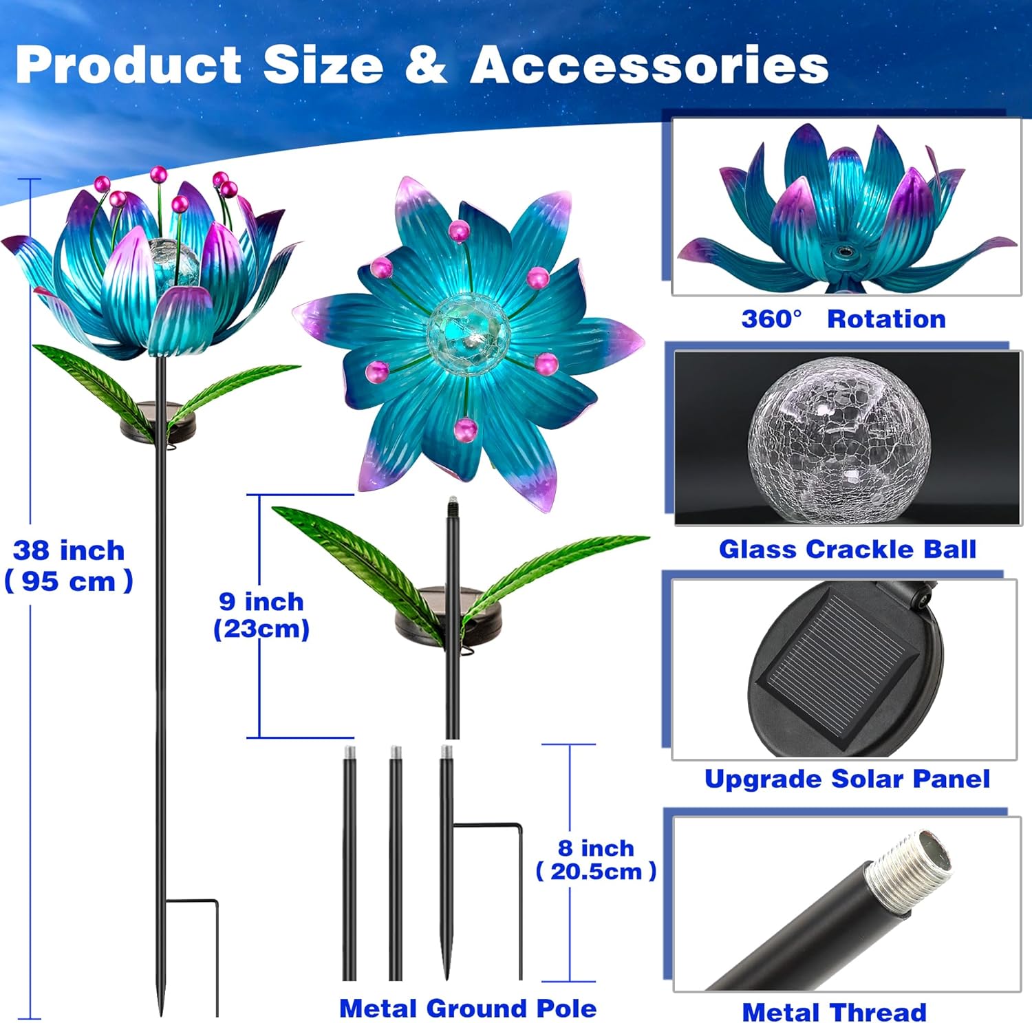 • 【 Solar Wind Spinners Outdoor 】Purple lotus flower lights wind spinner using waterproof LED burst spherical glass flower lights.It is beautiful and cute, it can decorate any place in the garden, it is beautiful during the day and at night, you can easily place and move it to any place you like!