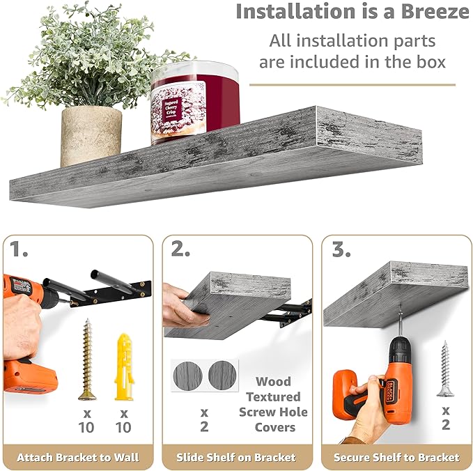 • Versatile & Functional Floating Wall Shelves: Install these floating shelves in the bedroom or bathroom to hold beauty/hair products - Place your wall shelf under a mirror in the entryway or exhibit family photos gallery style in a long hallway - Use as bathroom shelf, book shelf for wall, wall decor for bedroom, over the toilet shelf, kitchen floating shelves, floating nightstand, kitchen decor, living room wall decor, display shelf, and more