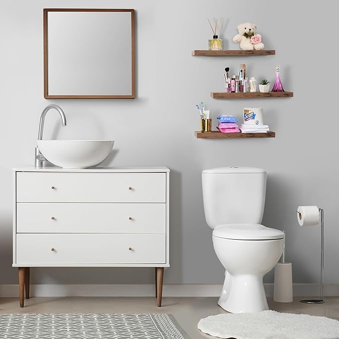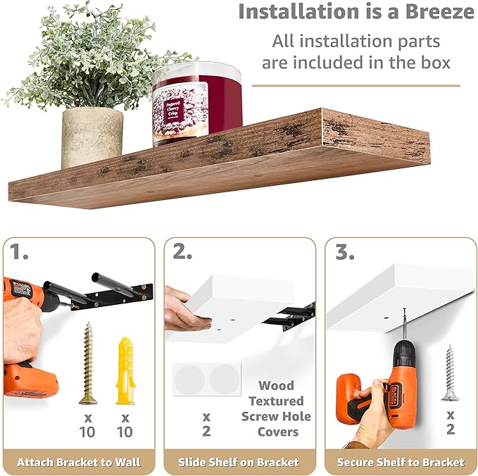 • Versatile & Functional Floating Wall Shelves: Install these floating shelves in the bedroom or bathroom to hold beauty/hair products - Place your wall shelf under a mirror in the entryway or exhibit family photos gallery style in a long hallway - Use as bathroom shelf, book shelf for wall, wall decor for bedroom, over the toilet shelf, kitchen floating shelves, floating nightstand, kitchen decor, living room wall decor, display shelf, and more