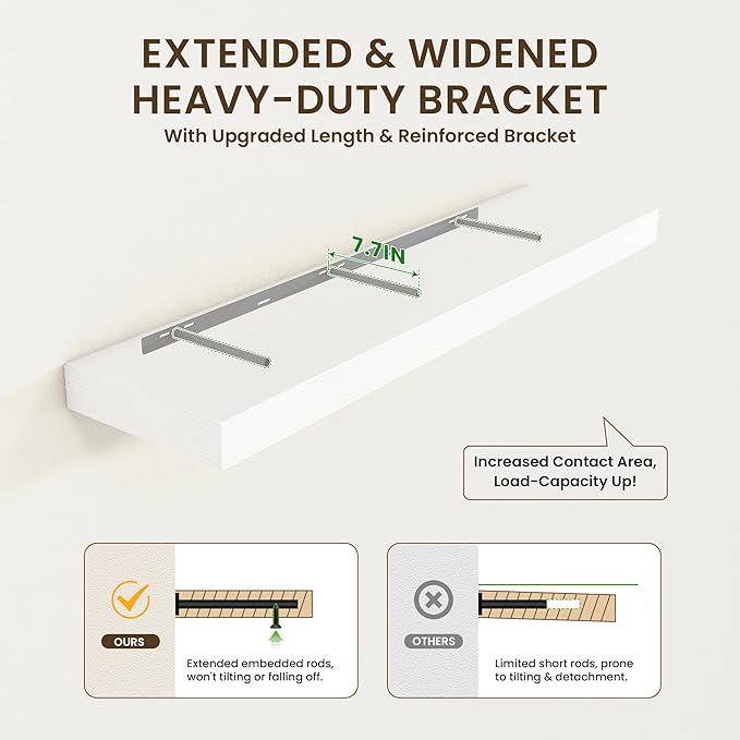 • EASY TO INSTALL - Come with all the installation hardware you need. We have a smart installation design. Thicken metal brackets help boards to be stable and load-bearing, vertical to the wall, and not sagging. The shelves have pre-drilled holes in the bottom to allow screws to secure the boards to the brackets to prevent them from slipping