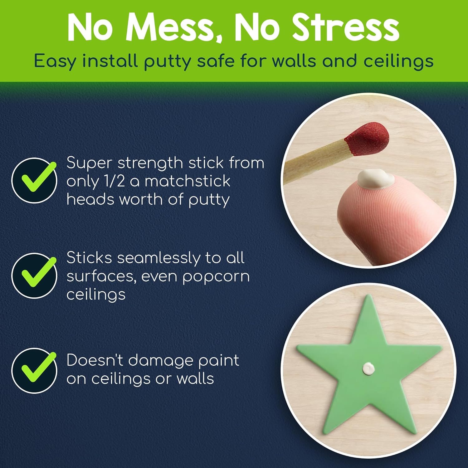 • Super Simple Set Up - It's something your child can even help with! Just take a tiny bit of putty, roll it into a ball, and place it at the center of each ceiling stars. Press them onto the ceiling with a little pressure and hold for 5 seconds. It's a fun and easy DIY project for you and your child to enjoy together.