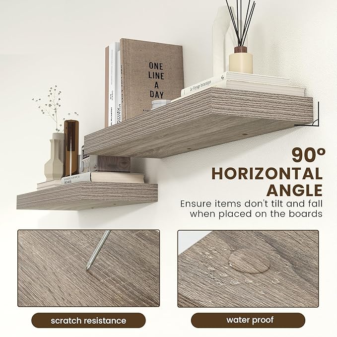• EASY TO INSTALL - Come with all the installation hardware you need. We have a smart installation design. Thicken metal brackets help boards to be stable and load-bearing, vertical to the wall, and not sagging. The shelves have pre-drilled holes in the bottom to allow screws to secure the boards to the brackets to prevent them from slipping