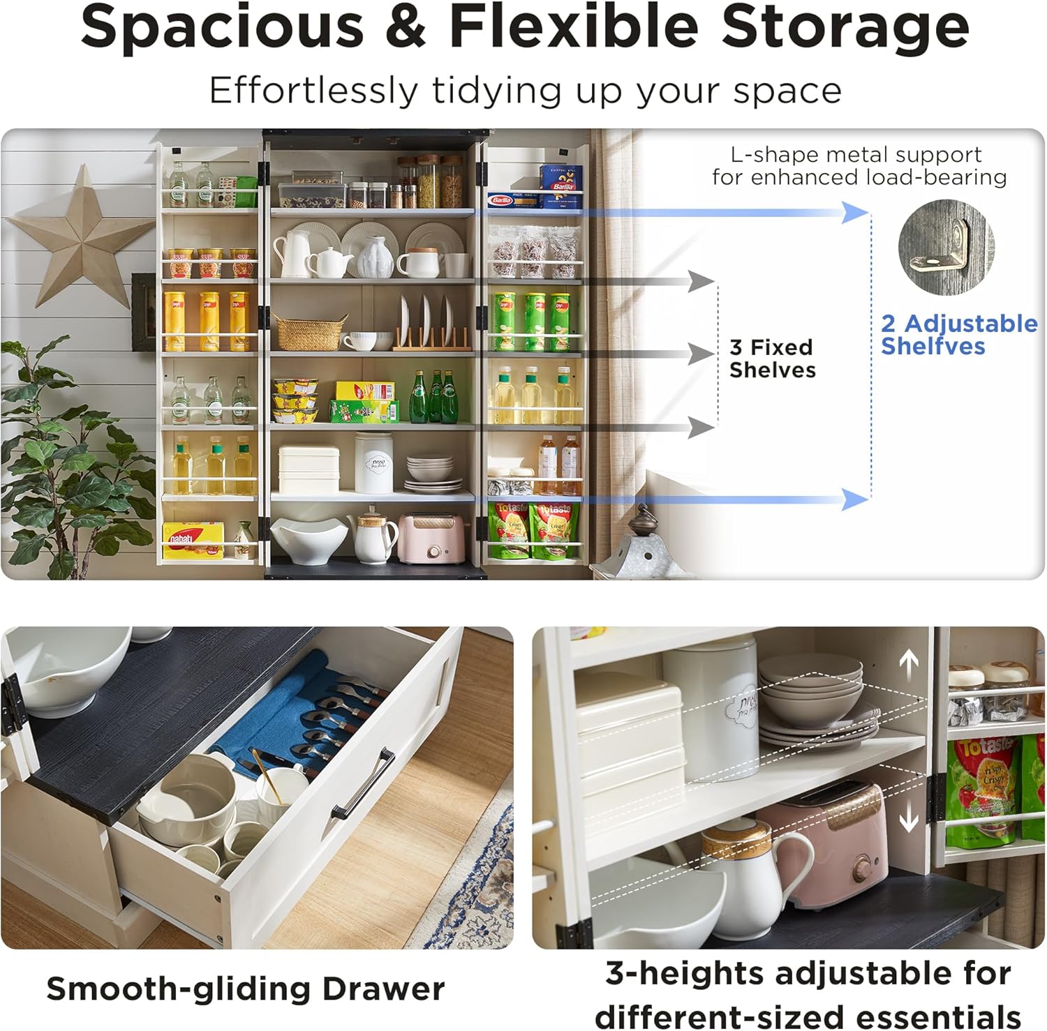 • ENJOY THE WELL-ORGANIZED STORAGE. The 12-door shelves, strategically designed with 3 different heights, maximize top cabinet space, ensuring easy access to small items like spices and olive oil. With a large cabinet, a spacious slide-out drawer, and 12 versatile door shelves, this pantry accommodates everything from food and dinnerware to kitchen appliances, effortlessly tidying up any space.