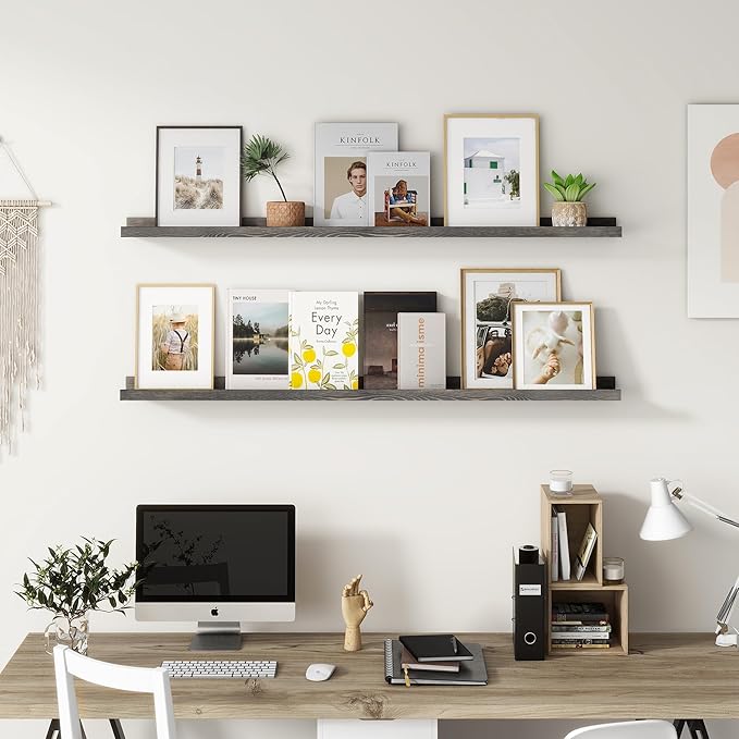Picture Ledge Shelf, Floating Shelves Set of 2, Solid Pine Wood 55'' Long Large Nursery Book Shelves for Toys Storage, Kids Bookshelf for Living Room Bedroom Decor Books Photo Frames, Grey