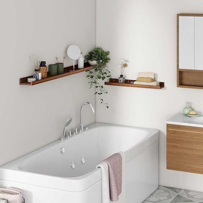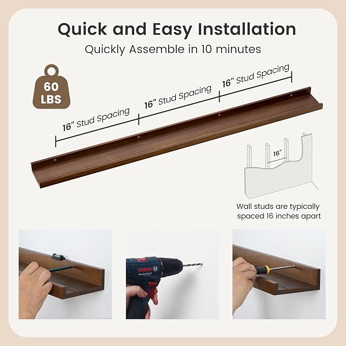 • Easy to Install: You will get a level, screws for the wall, drywall anchors, a detailed installation guide, and two beautiful hand-crafted solid pine wood shelves. With the level, you can make sure your picture ledge shelves are well aligned. Just follow the simple instruction to install the hanging shelves for wall decor within 10 minutes. We add additional screw and anchor to the hardware bag just in case. If you have any questions about our products, please feel free to contact us