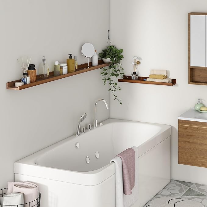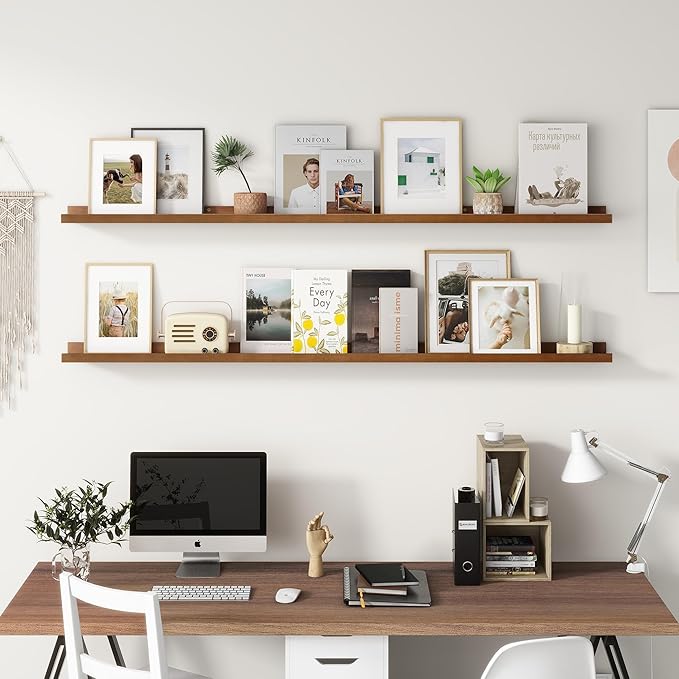 • Easy to Install: You will get a level, screws for the wall, drywall anchors, a detailed installation guide, and two beautiful hand-crafted solid pine wood shelves. With the level, you can make sure your picture ledge shelves are well aligned. Just follow the simple instruction to install the hanging shelves for wall decor within 10 minutes. We add additional screw and anchor to the hardware bag just in case. If you have any questions about our products, please feel free to contact us