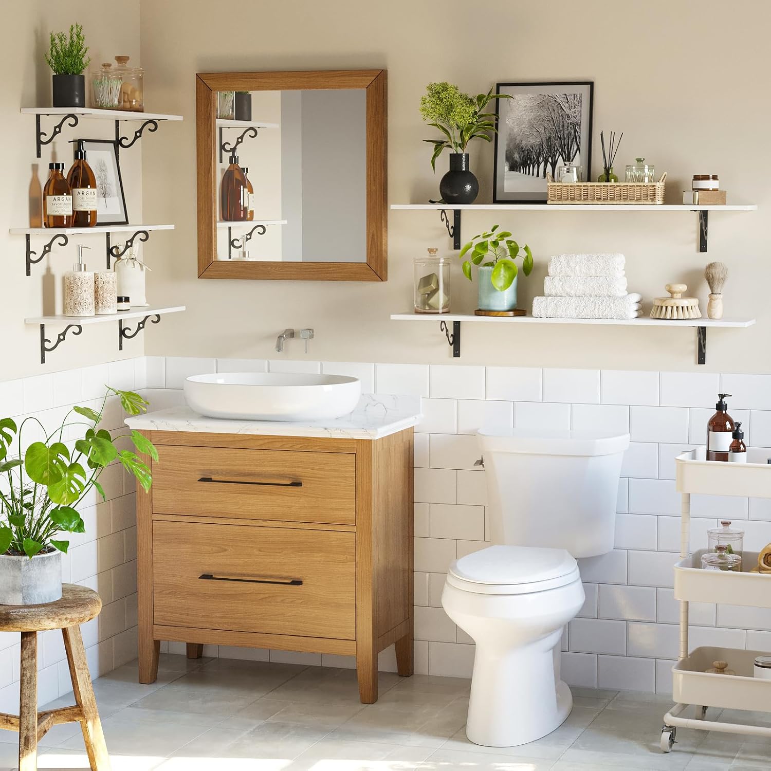 • 【Well Made】Made of premium particleboard and expertly designed metal brackets, sturdy and durable. Thicker brackets bring added stability and stronger load-bearing capacity(up to 33lbs), supporting the wood shelves without sagging over time. All edges are well-finished for smoothness