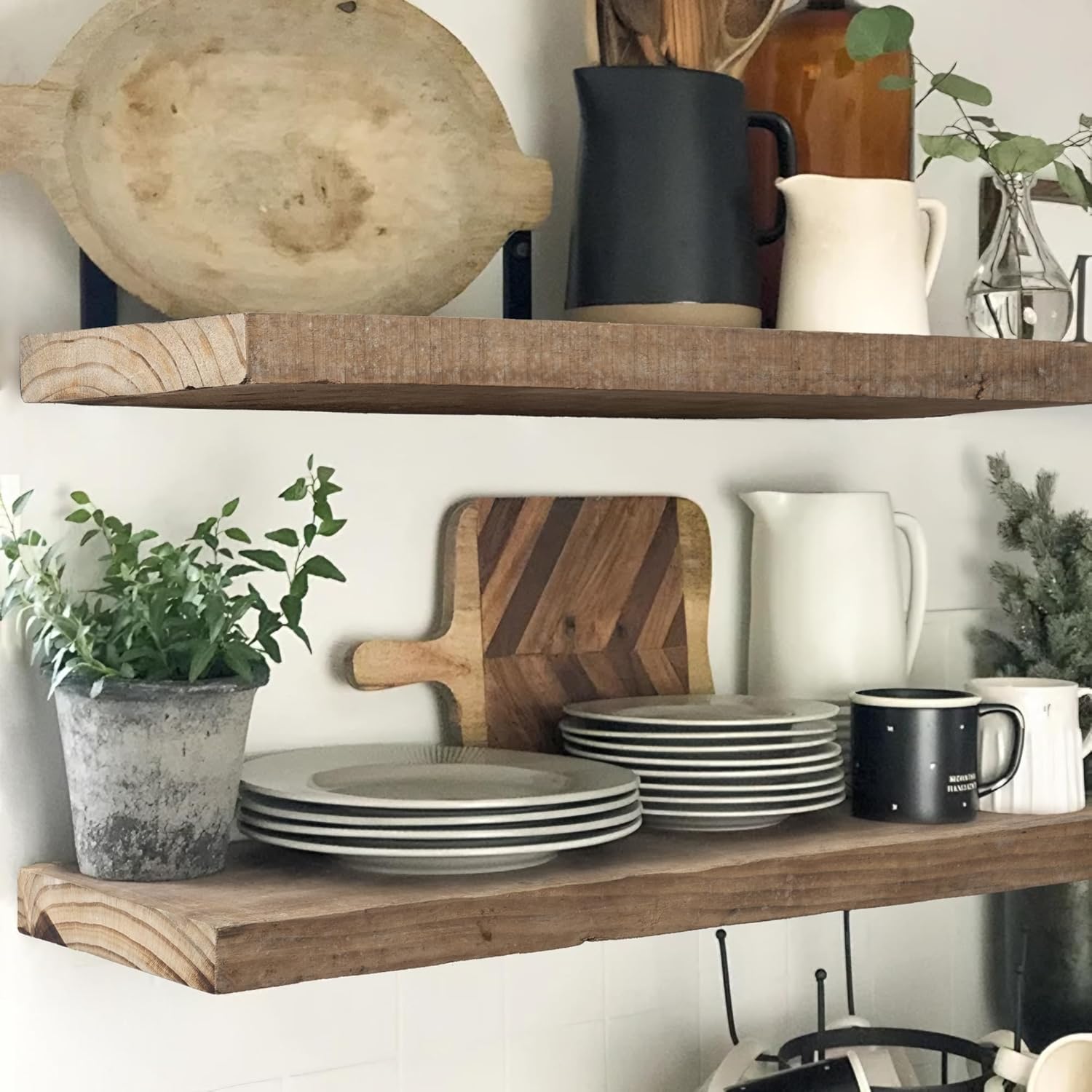 • Sturdy & Sleek Mounting - Our floating shelves feature heavy-duty brackets that install seamlessly into wall studs, providing up to 30lb of weight capacity per shelf. The flush mount design hides the brackets for a clean, rustic farmhouse style look, while screws at the bottom keep wall shelves securely in place.