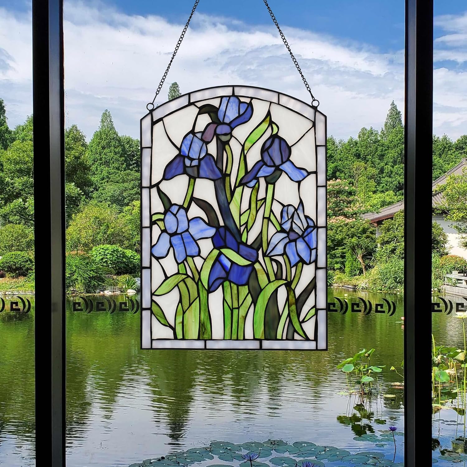YOURANJU Iris Stained Glass Window Hanging 16" H x 11" W Tiffany Style Blue Rectangular Window Panel Suitable for Living Room Bedroom Kitchen Window Decoration Hangings with Chain