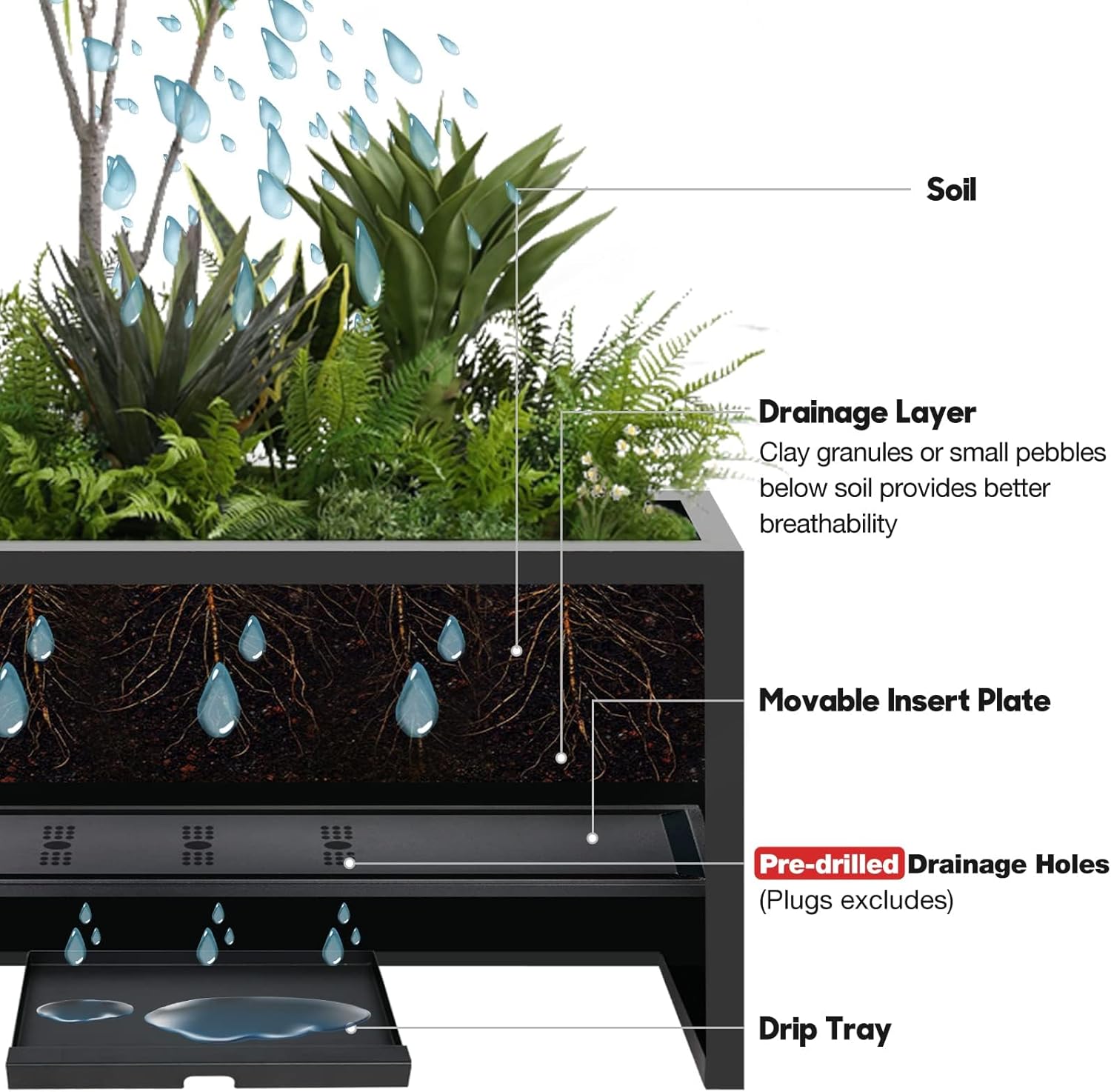 • METAL PLANT BOX: This black planter is made of steel with powder coating; The surface is wear-resistant, corrosion-resistant and it has a long service life; You don't have to worry about rain corroding the surface of this pot; Ideal for commercial or residentia use;