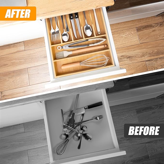 • ✅【Deep Compartments & Reinforced Base】Our utensil drawer organizer features compartments with a depth of 1.9 inches, helping maximize drawer space and perfect for storing more essential tools and gadgets. The utensil silverware drawer organizer flatware cutlery tray comes with a reinforced base, ensuring durability for long-term use, and is ideal for supporting the weight of heavy-duty utensils and knives. Keep everything you need conveniently at hand while cooking, neatly visible, and easy to grasp when preparing the next meal in the kitchen.
