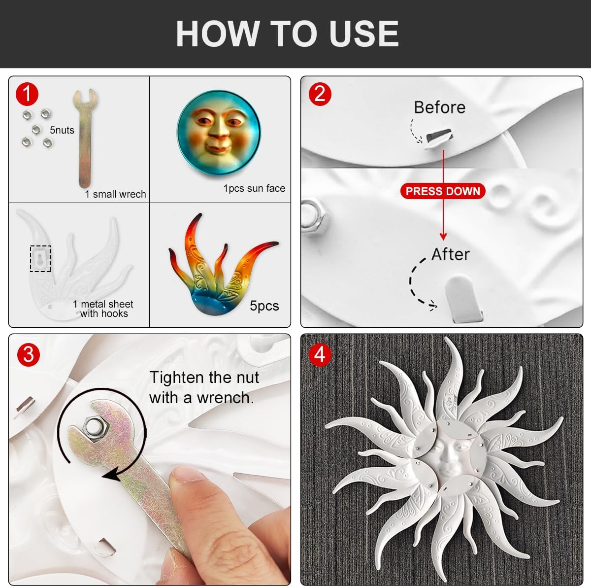 • 【Easy to Install】: The metal sun wall decoration comes with a sturdy metal hook, making it easy to install on the wall or ceiling. You can easily install it in a few minutes according to the installation instructions we provide.