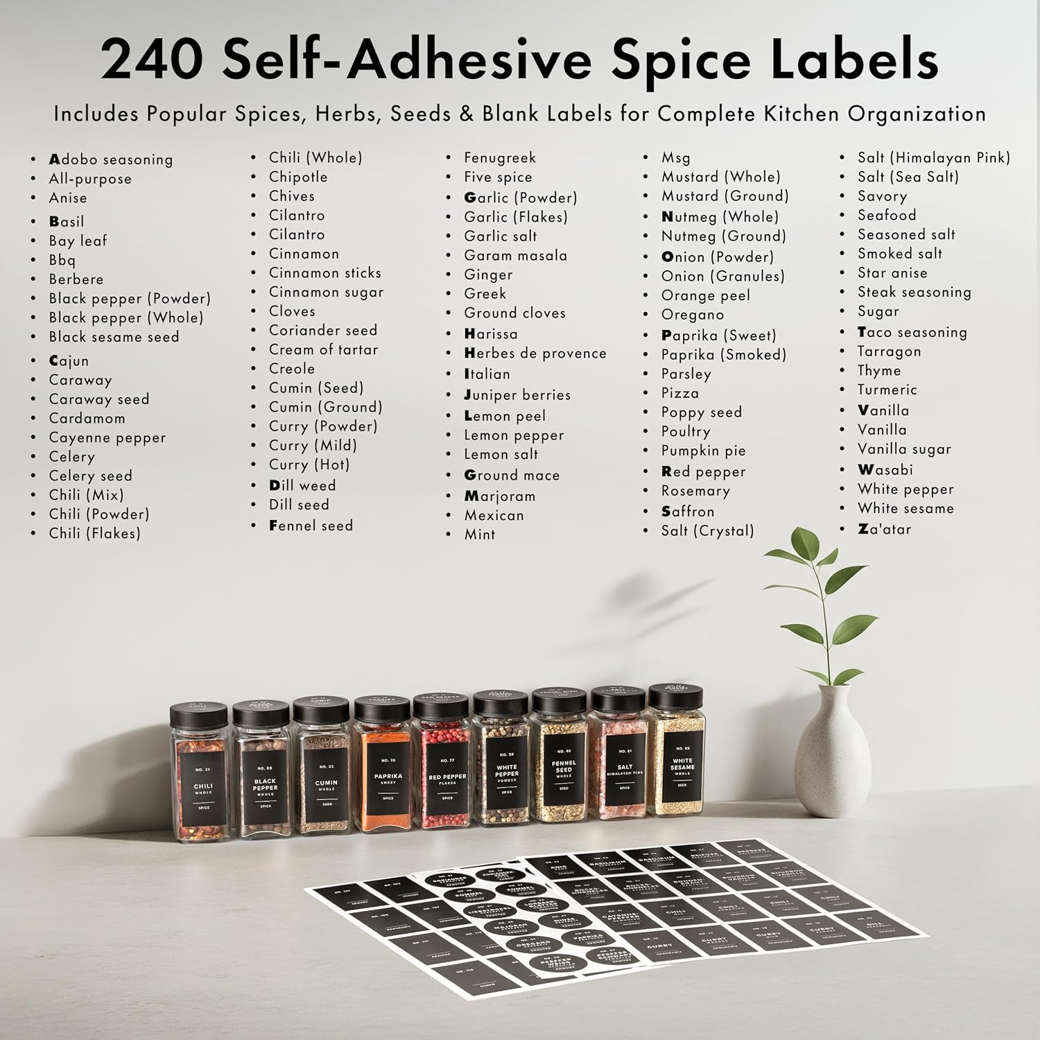• PREMIUM LABELS: Our spice labels are made from a thicker, high-quality material for increased durability. The clean dark color adds a sophisticated and polished look to your kitchen or pantry.