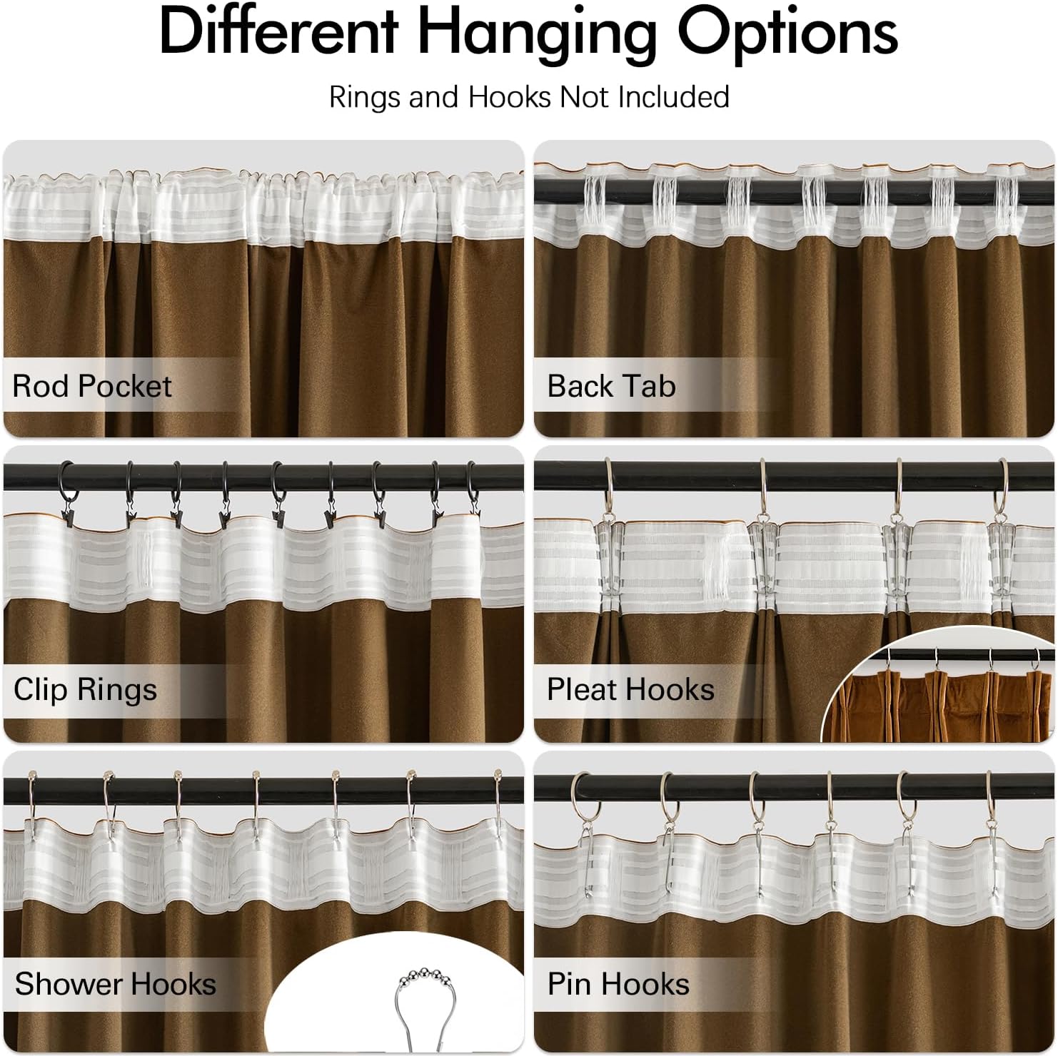 • HANGING OPTIONS: Each curtain panel has 3-in-1 top style design: rod pocket, back tab and pinch pleat. Back loop (2.3 inch) and rod pocket (3.1 inch) fit most standard rod. Curtains also can be hung with clip rings or curtain hooks. 3 ways to meet your various needs.