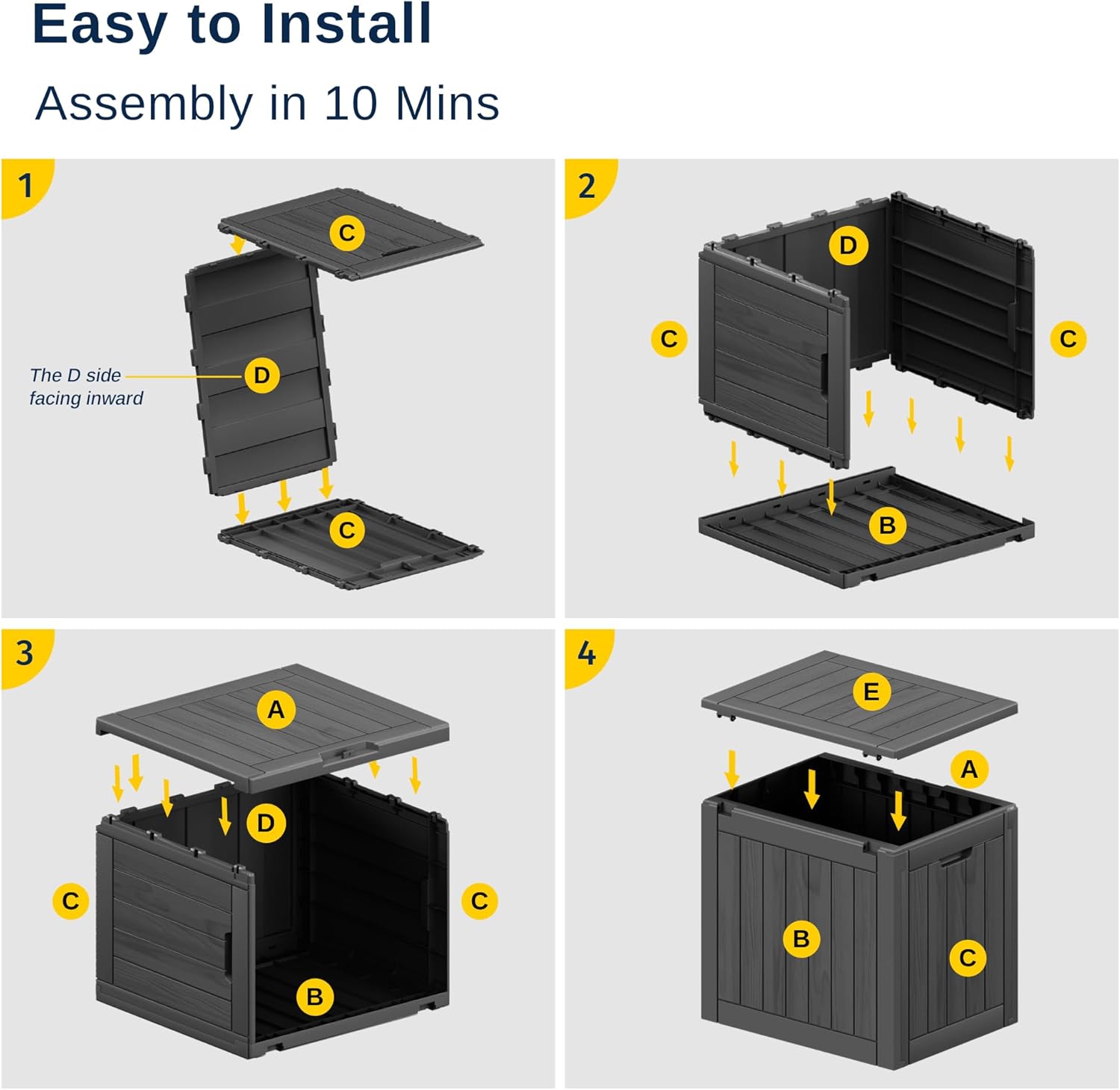 • π—ͺπ—”π—§π—˜π—₯𝗣π—₯𝗒𝗒𝗙 𝗔𝗑𝗗 π—™π—”π——π—˜ 𝗣π—₯𝗒𝗒𝗙: This deck box adopted upgraded resin material (SGS 1000plus) that protects its exterior from fading and keeps its interior dry no matter what the weather is