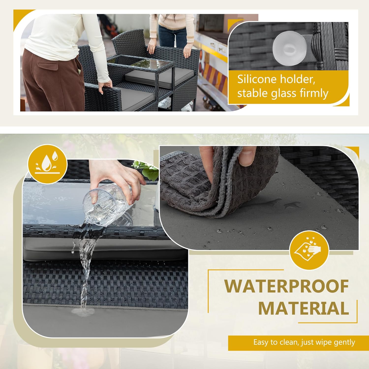 • Built-in Table & Storage: In the middle of the patio loveseat integrated storage compartment and small table, you can put some drinks, snacks, fruits within your reach in the tempered glass top. The small storage space below you can put books, tea cans and etc. This design saves your space and add more convenience.