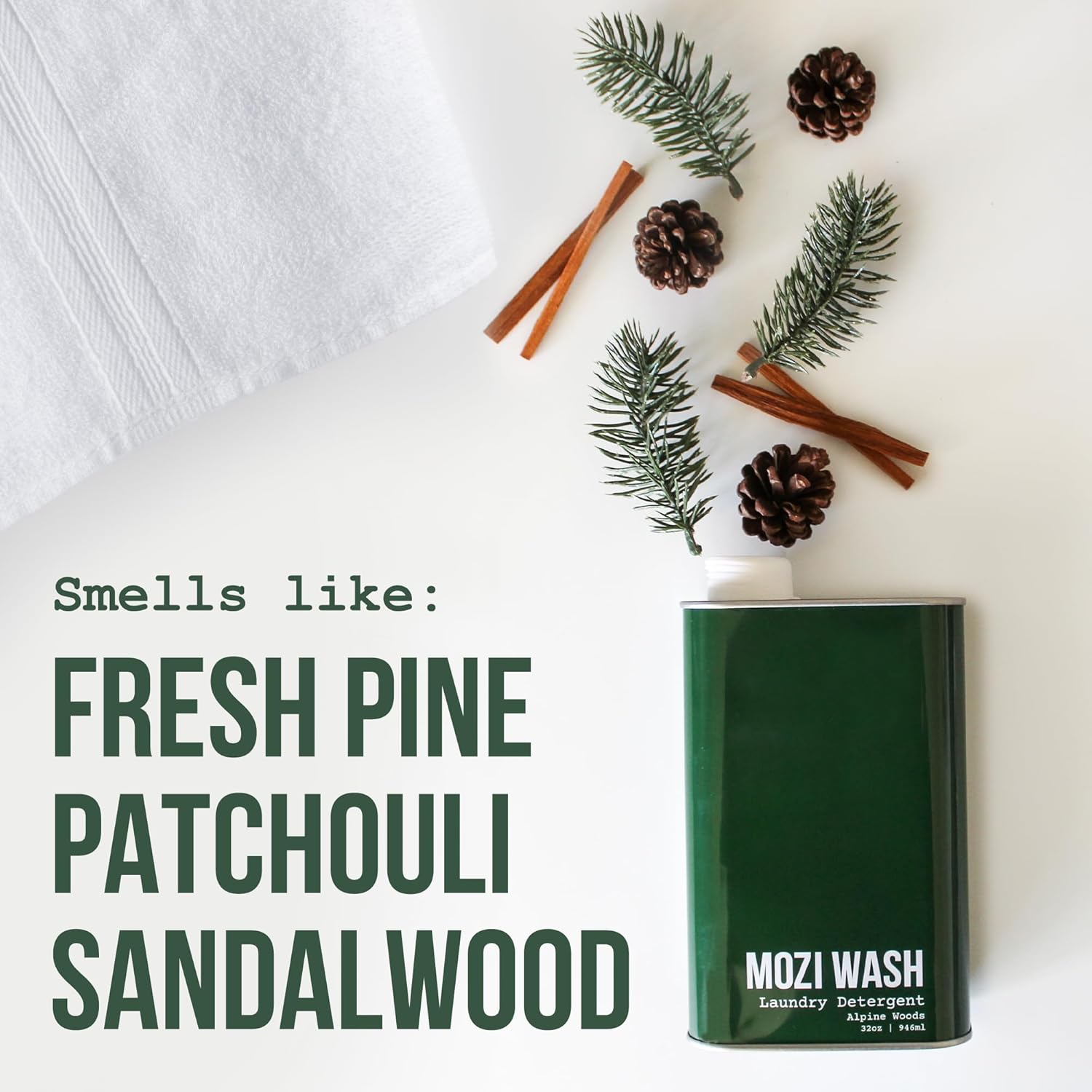 • ALPINE WOODS: Earthy & Bold. A deep, woodsy scent rooted in sandalwood, pine, and patchouli. Grounding, mysterious, and addictive—this bold laundry detergent liquid leaves clothes smelling rich and rugged.