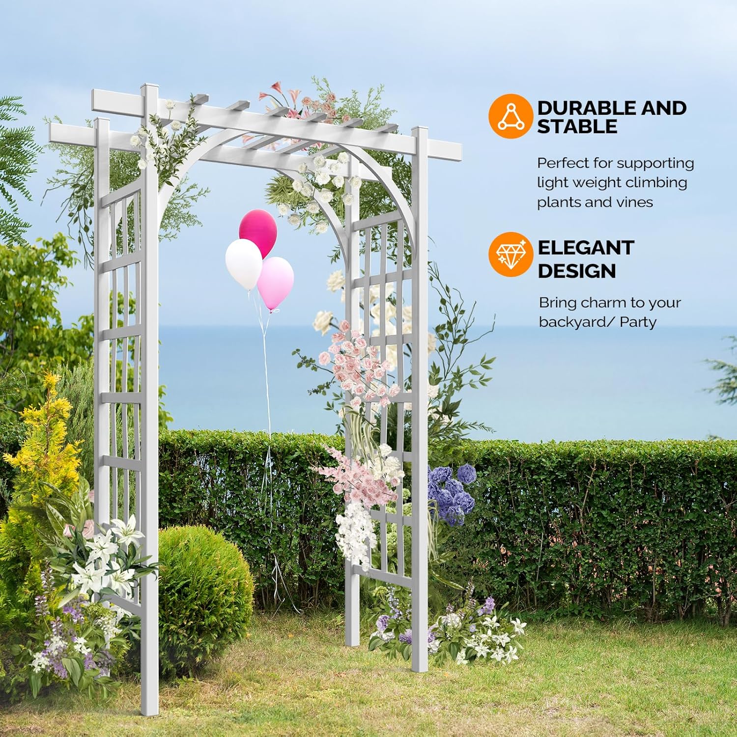 • Elegant Arch: Elegant white is suitable for weddings, classy parties and just about any occasion. Whether standing alone or covered with climbing vines and flowers, these outdoor arch add a striking focal point to your event. Adding grace and prominence to any outdoor venue with the Arbor features squared lattice side panels