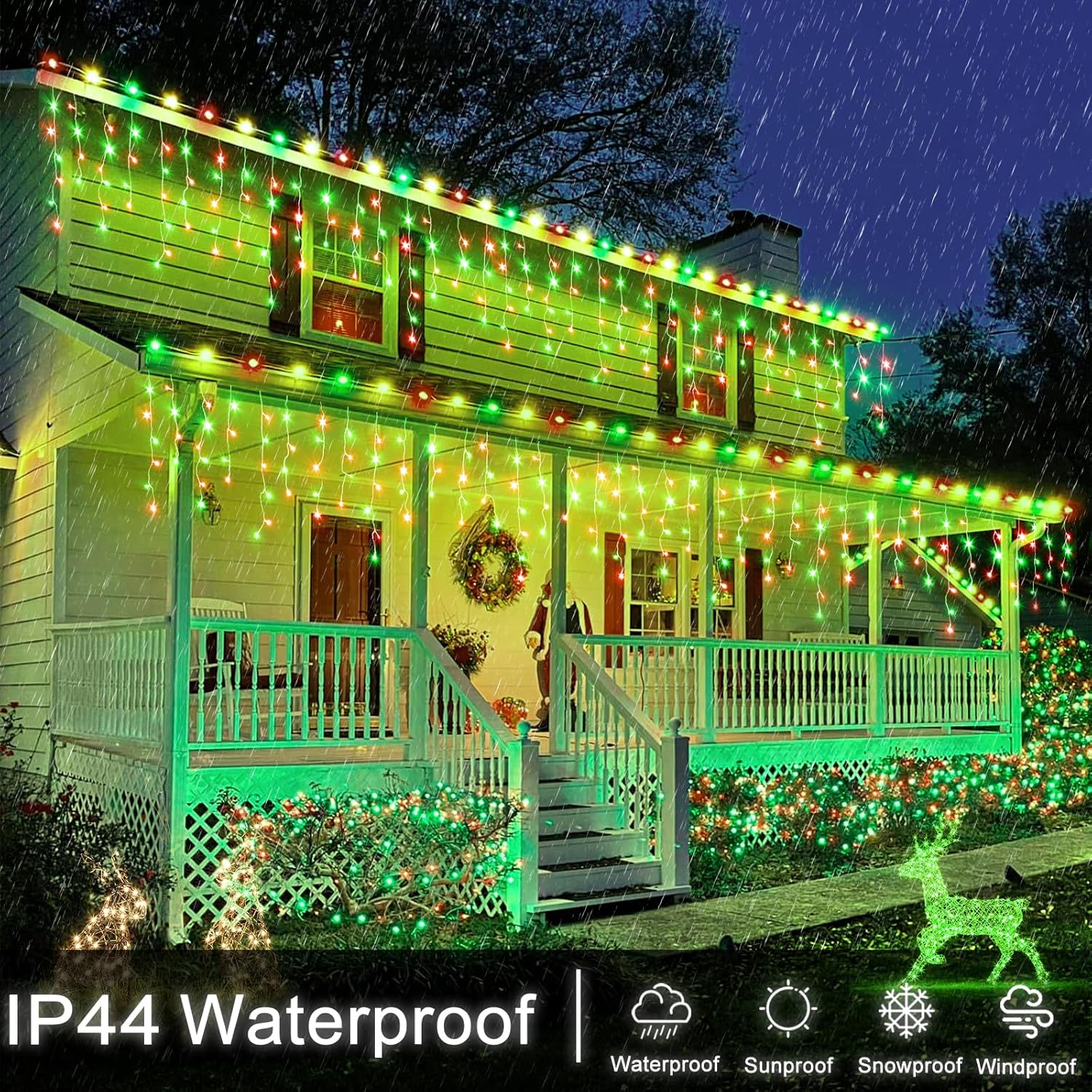 • Waterproof&UL certified: The icicle Christmas lights are IP44 waterproof,which is perfect for outside decoration and can work normally even in harsh weather. Christmas fairy lights has approved UL Certification,output voltage of the Christmas icicle lights is 29V,it's completely safe to touch.These icicle string lights are made by 100% high-quality copper wire,it will not overheat after many days of usage.