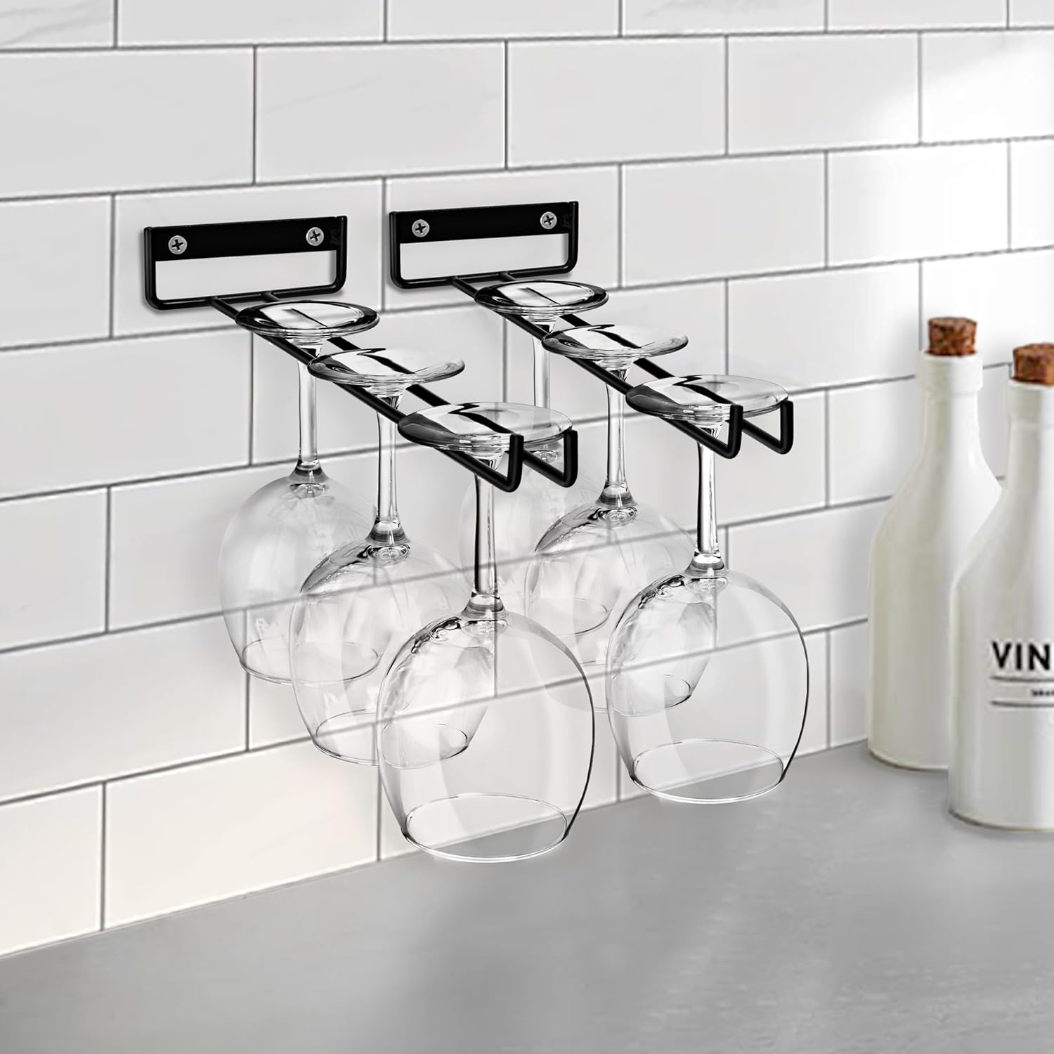 • Under Cabinet Wine Glass Rack (2 Pack): Mounts directly under cupboard for visible storage of your glassware - Stores 3 of your favorite stemmed wine glasses or 4 champagne glasses per rack depending on the size - Can also be used as a mug shelf for mug storage - Use display shelf to organize your choice of glassware, china storage, bar wall decor, wine glass storage, and more