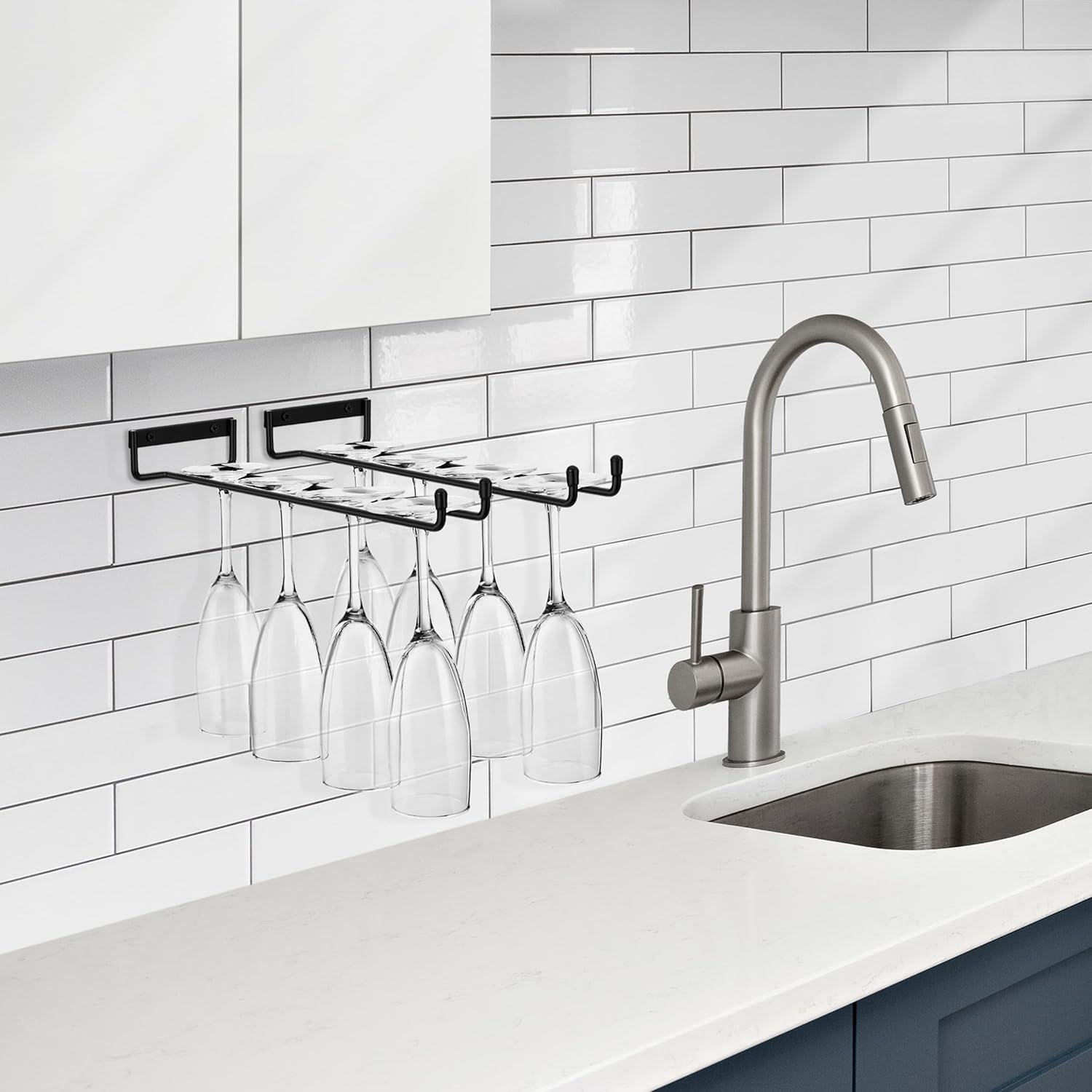 • Under Cabinet Wine Glass Rack (4 Pack): Mounts directly under cupboard for visible storage of your glassware - Stores 3 of your favorite stemmed wine glasses or 4 champagne glasses per rack depending on the size - Can also be used as a mug shelf for mug storage - Use display shelf to organize your choice of glassware, china storage, bar wall decor, wine glass storage, and more