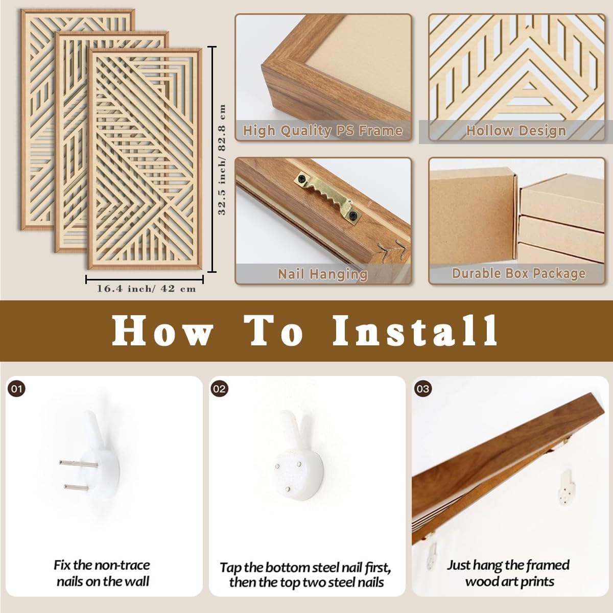 • 【Size for Easy Displaying】This set of modern minimalist wood wall art is about 16*32 inches. On the back of the minimalist art wall decor, sawtooth hooks have been installed in advance, and the packaging box is equipped with straight seamless nails and anti-collision particles. So you can easily hang or disassemble the mid century modren wall decor framed, very easy to operate.