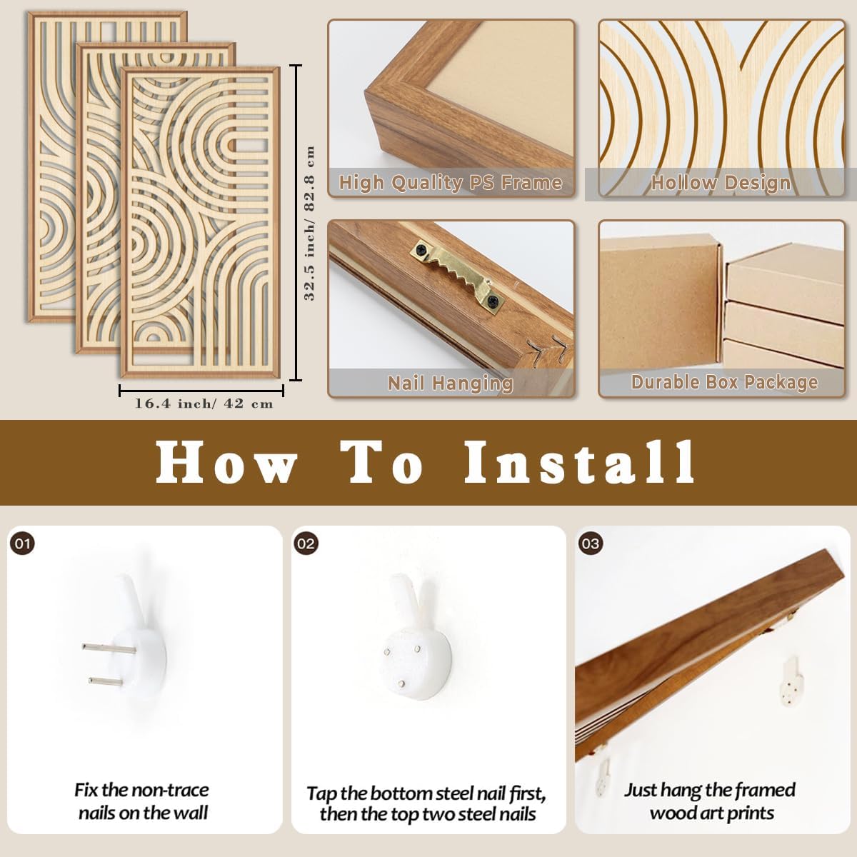• 【Size for Easy Displaying】This set of wooden boho geometric wall decor for wall is about 16x32 inches. On the back of the wooden wall art decor has been installed with sawtooth hooks in advance, so you can easily hang or disassemble them by using the nails and transparent silica gel mats provided in the package.