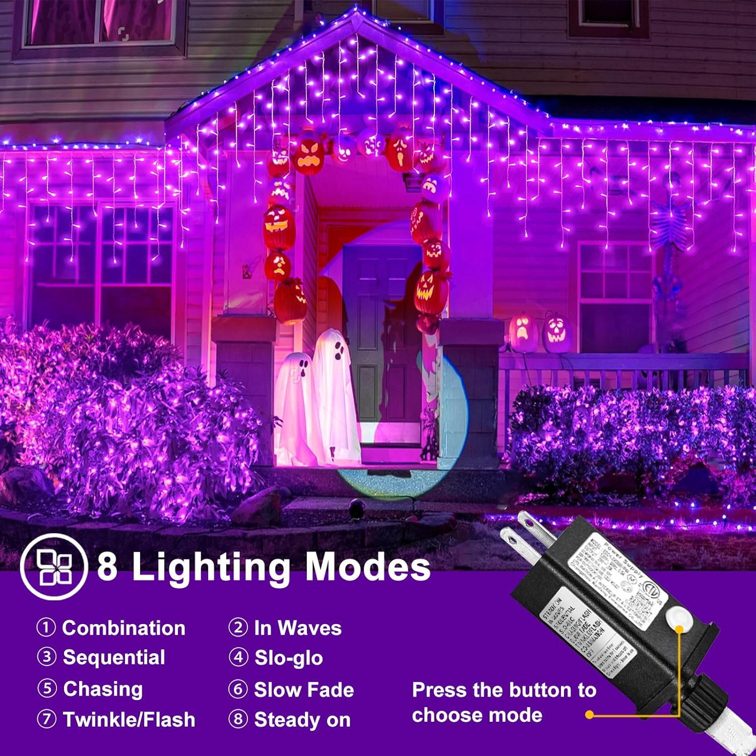 • Upgraded 8 Modes Halloween Lights: The icicle Lights have 8 selections of light pattern: 1.Combination 2.In Waves 3.Sequential 4.Slo-Glo 5.Chasing/Flash 6.Slow Fade 7.Twinkle/Flash 8.Steady On. Different lighting effects are controlled by the button on the plug. These beautiful and vibrant outdoor lights will bring you a lot of festive atmosphere.