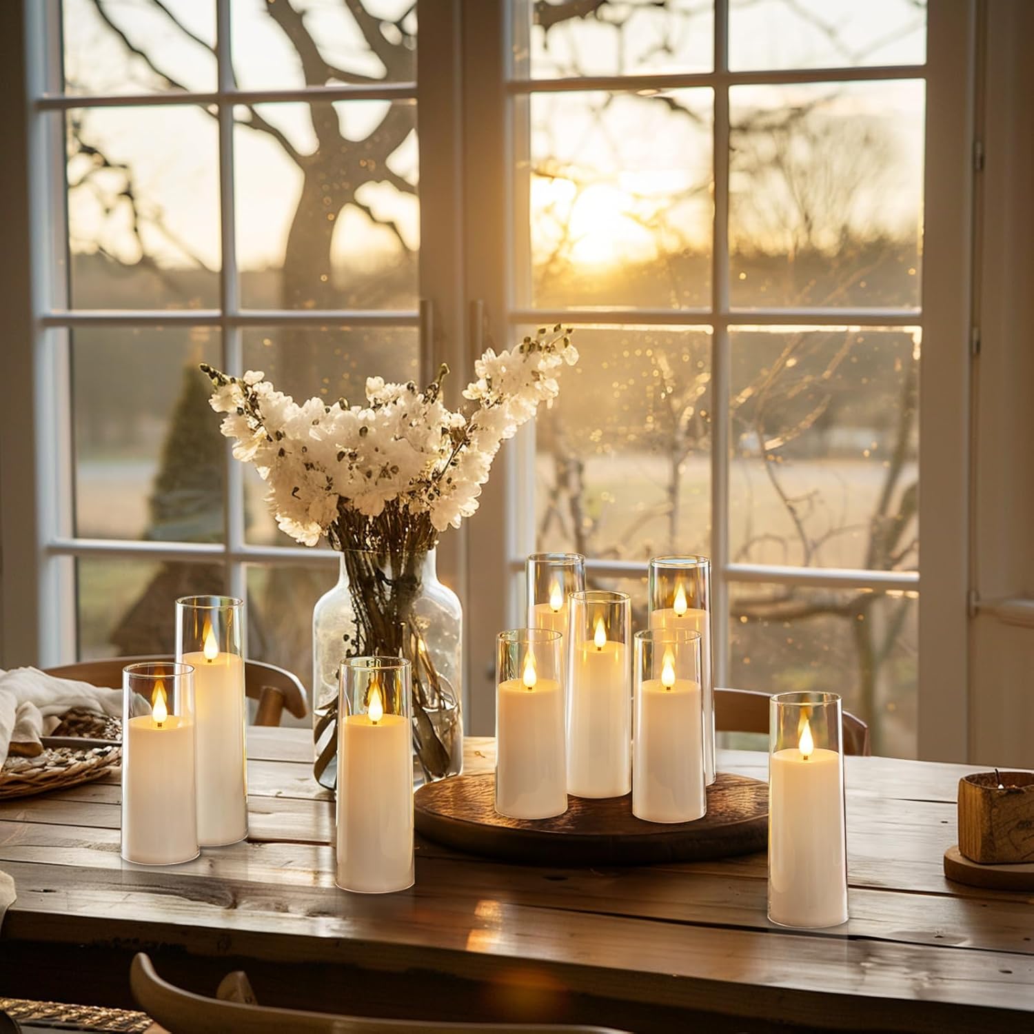 • Realistic Flameless Candles: Acrylic Candle Shell + 3D flame, flickering softly and giving these battery candles a warm yellow and blue glow, creating a cozy feeling, which is perfect for home, festival decorations, and gifts