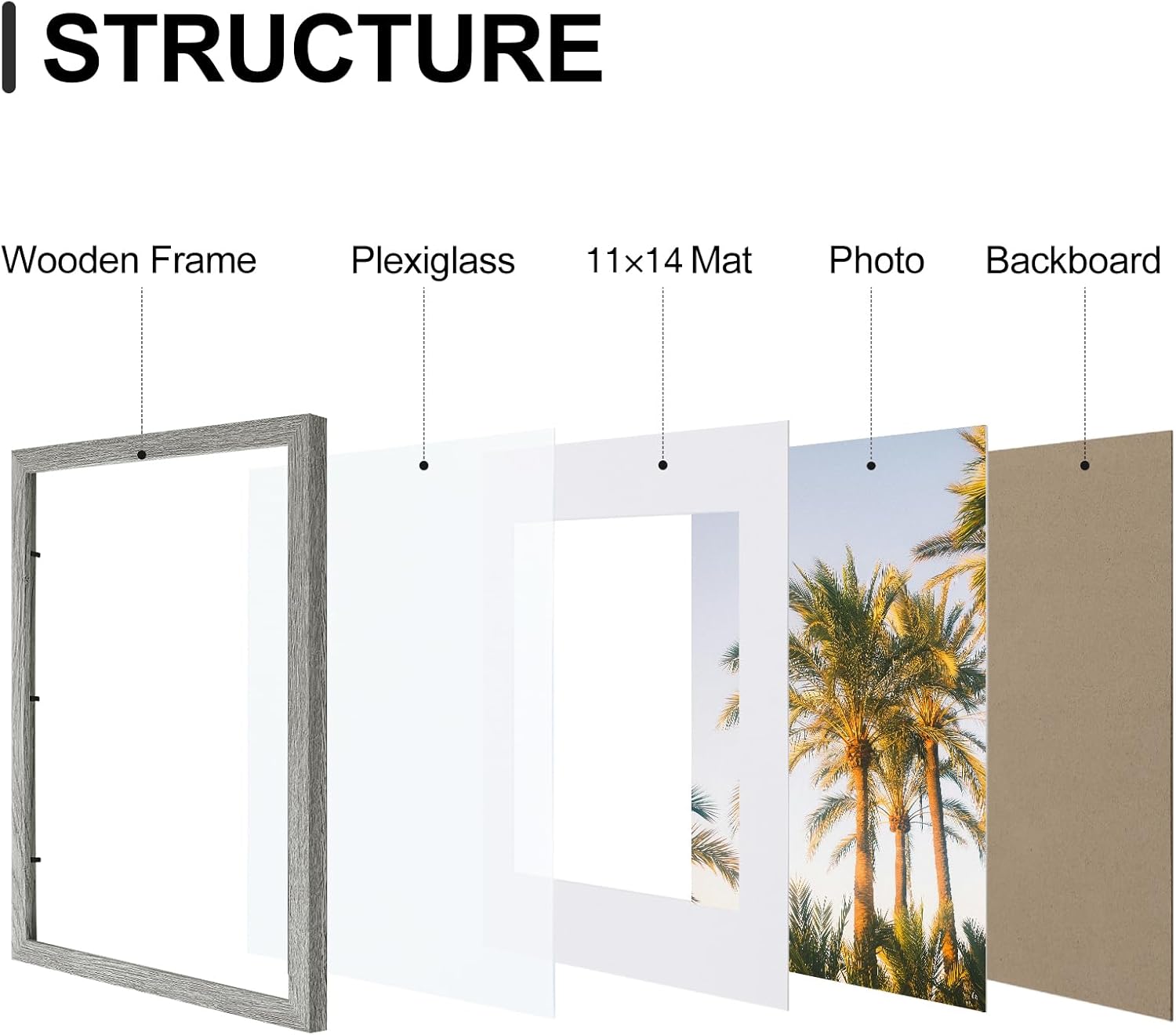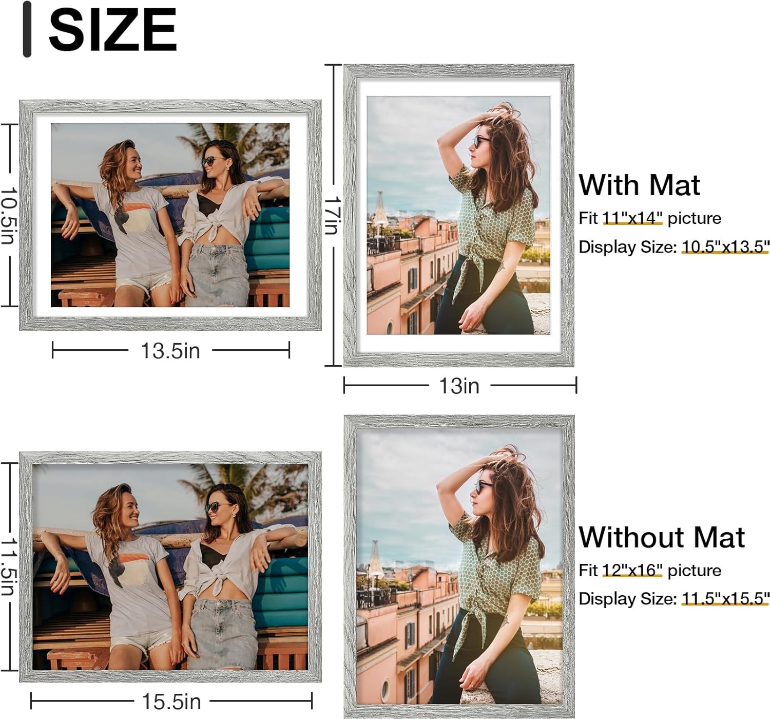 Vittanly 12x16 Picture Frames Set of 9, Shatter Resistant Plexiglass, Display 11x14 Pictures with Mat or 12x16 without Mat, Photo Frames for Wall Mount, Engineered Wood, Grey