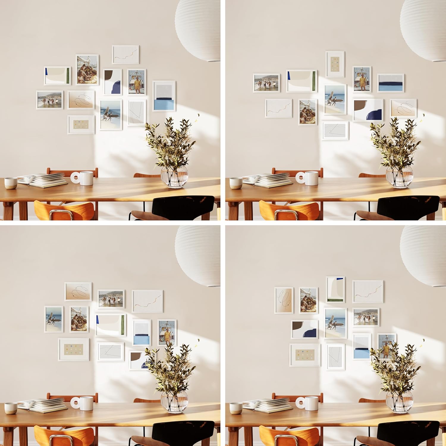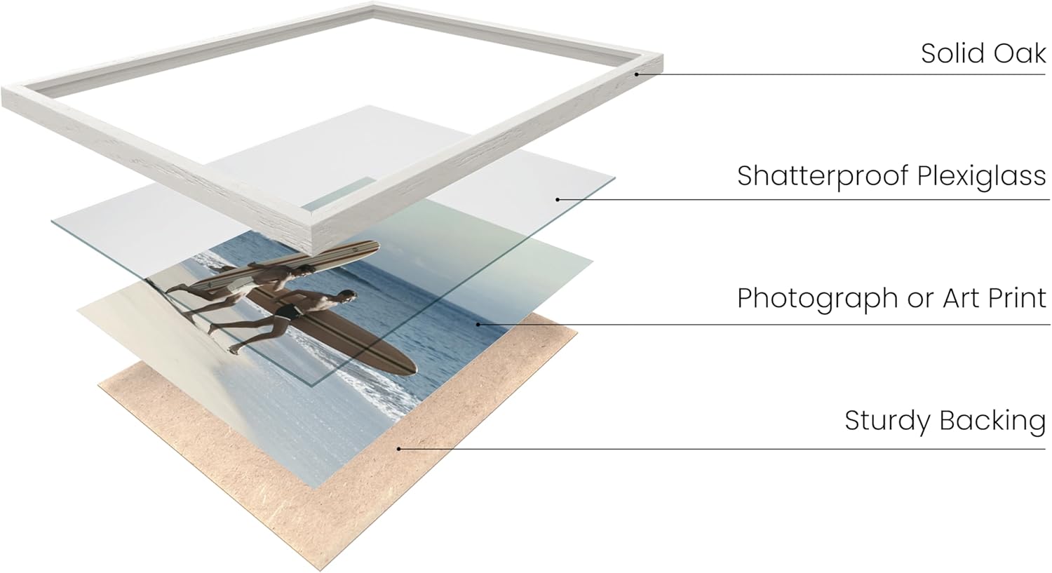 • PREMIUM WALL ART: Our tabletop picture frames will add the finishing touch to your art or photograph. They're equipped with plexiglass covered by protective film and two metal hangers for horizontal or vertical hanging. For added convenience, our white gallery wall frame set is shipped in a durable box, securing their protection throughout transit