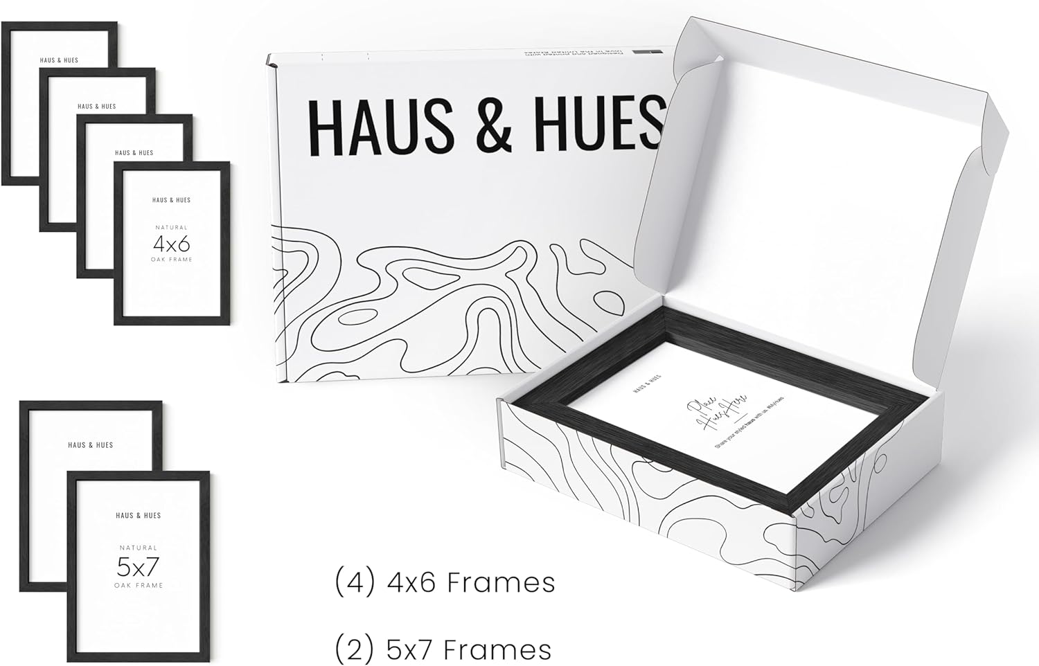 HAUS AND HUES Black Oak Wood Gallery Wall Tabletop Frames Made with Real American Oak and Shatter-free Plexiglass - Set of 6 (Four 4x6, Two 5x7, Framed Black)