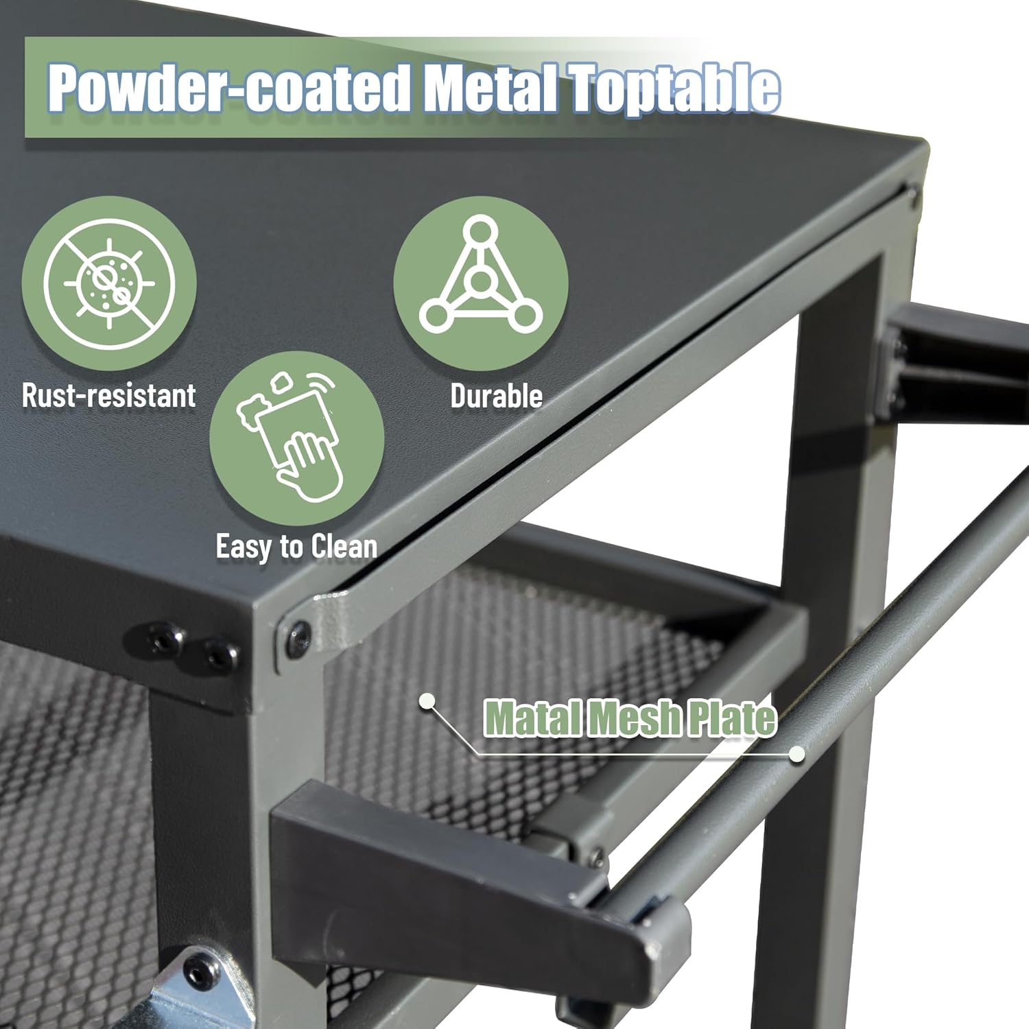 • Rust-Proof Countertop-- Domi food prep table enjoys a durable powder-coated metal countertop that is resistant to rust, ensuring longevity and easy maintenance for your outdoor grilling adventures.