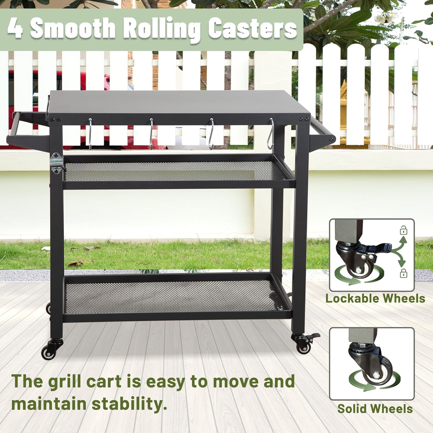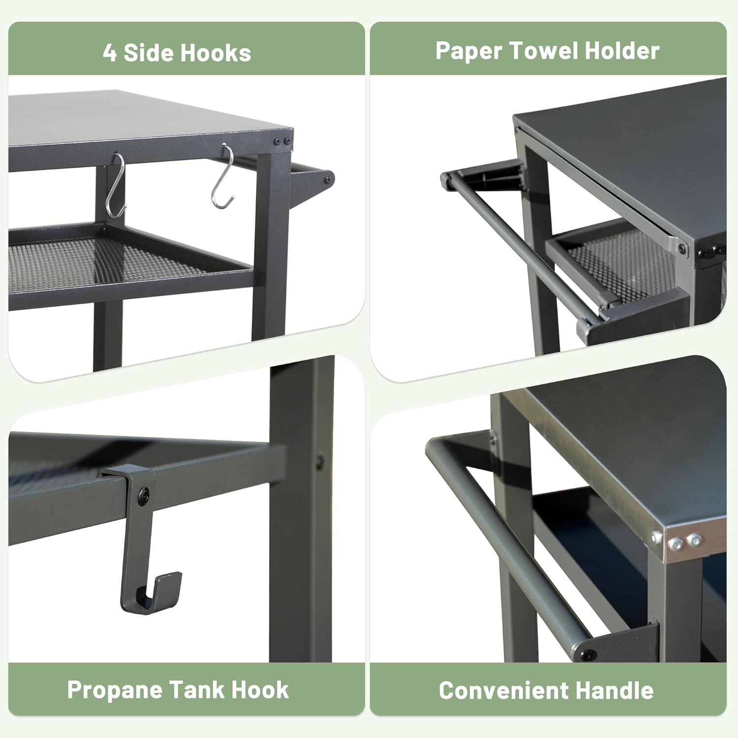 • Full & Useful Accessories- The food prep cart table includes paper towel holder, paper tissue holder, propane tank hook, bottle opener, 4 multi-functional tool hooks, etc, organizing all your favourite utensils for different cooking propose.