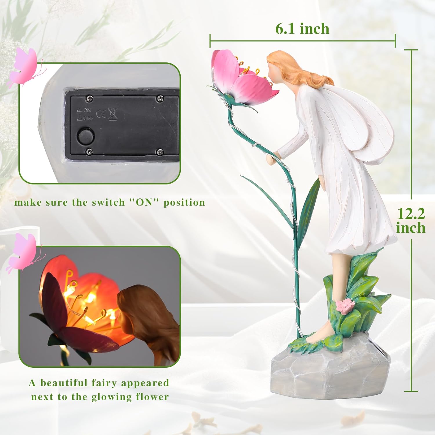 • 【Fairy Garden Decorations】Elegant fairy standing on the stone gets closer to this beautiful pink flower and presents a warm and peaceful scene in yard. the pink flower will turn on at night to glow warm light for your yard.