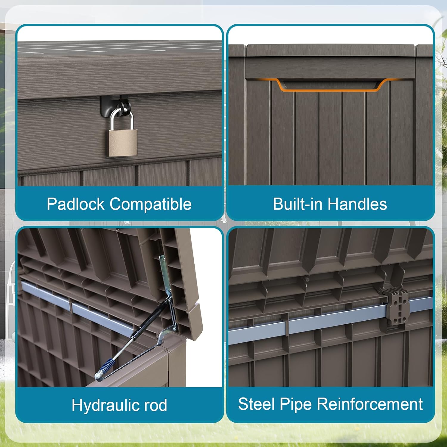 • Safety design: Each deck box has lockable holes (not included) for added security; in addition, the box is equipped with a hydraulic stand, which allows easy opening and slow closing and prevents hand pinching. The outdoor waterproof deck box has built-in handles on both sides, ensuring easy grabbing and moving.