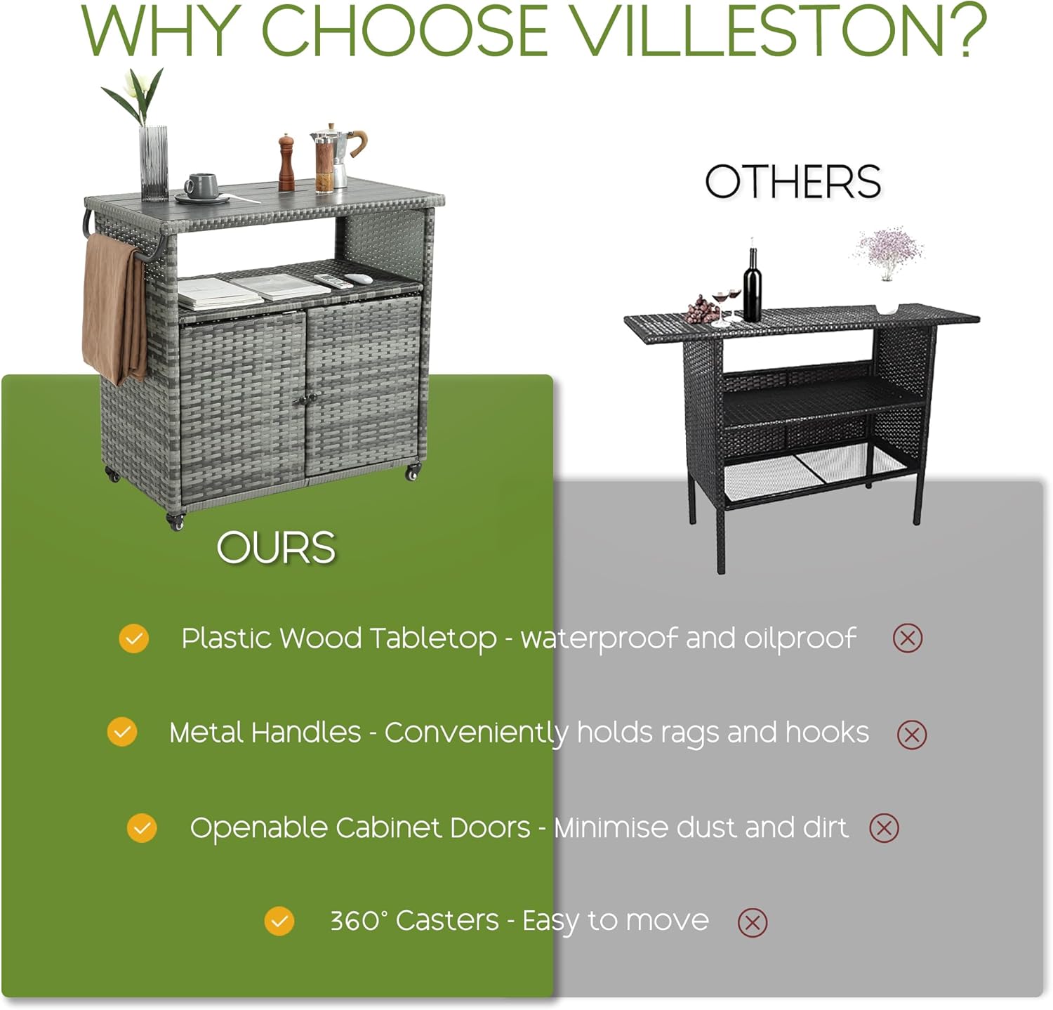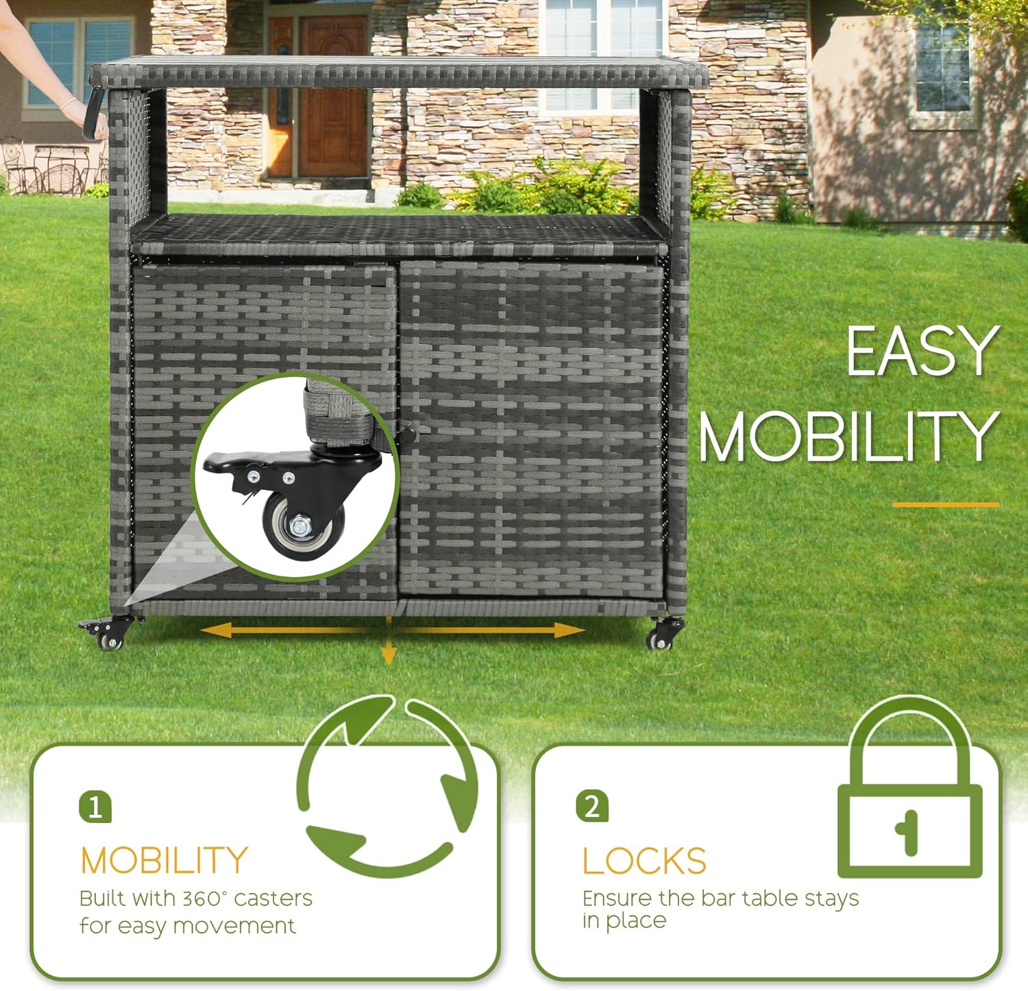 • DURABLE RELIABILITY: The outdoor kitchen cart is equipped with 360° smooth wheels for effortless movement to any position, and one side of the wheels is equipped with a locking feature to keep it in place