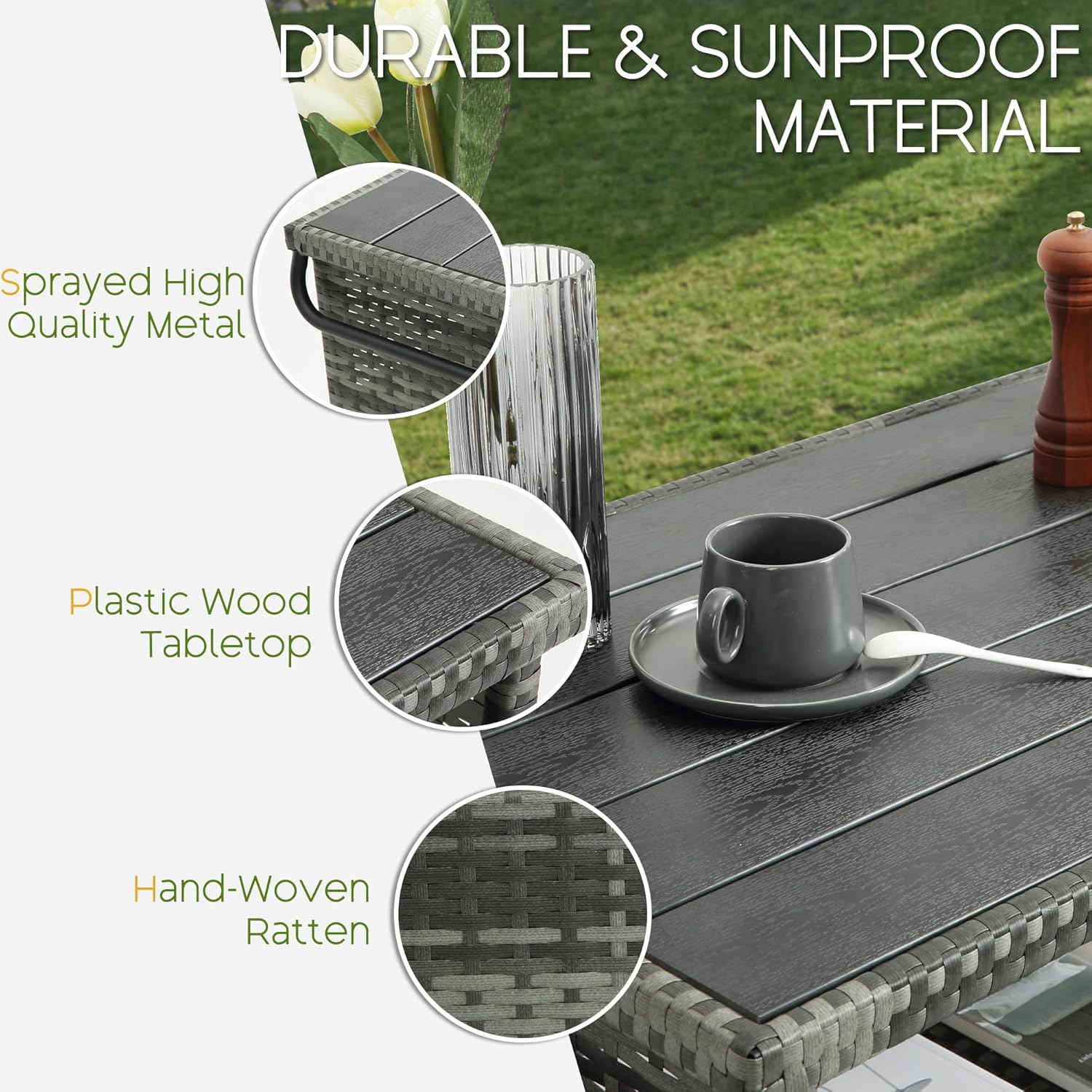• PLASTIC WOOD TABLETOP: The backyard bar features a high-quality plastic wood tabletop; the baffle swivels to create two shelves for additional storage space; and can be cleaned with a simple wipe down