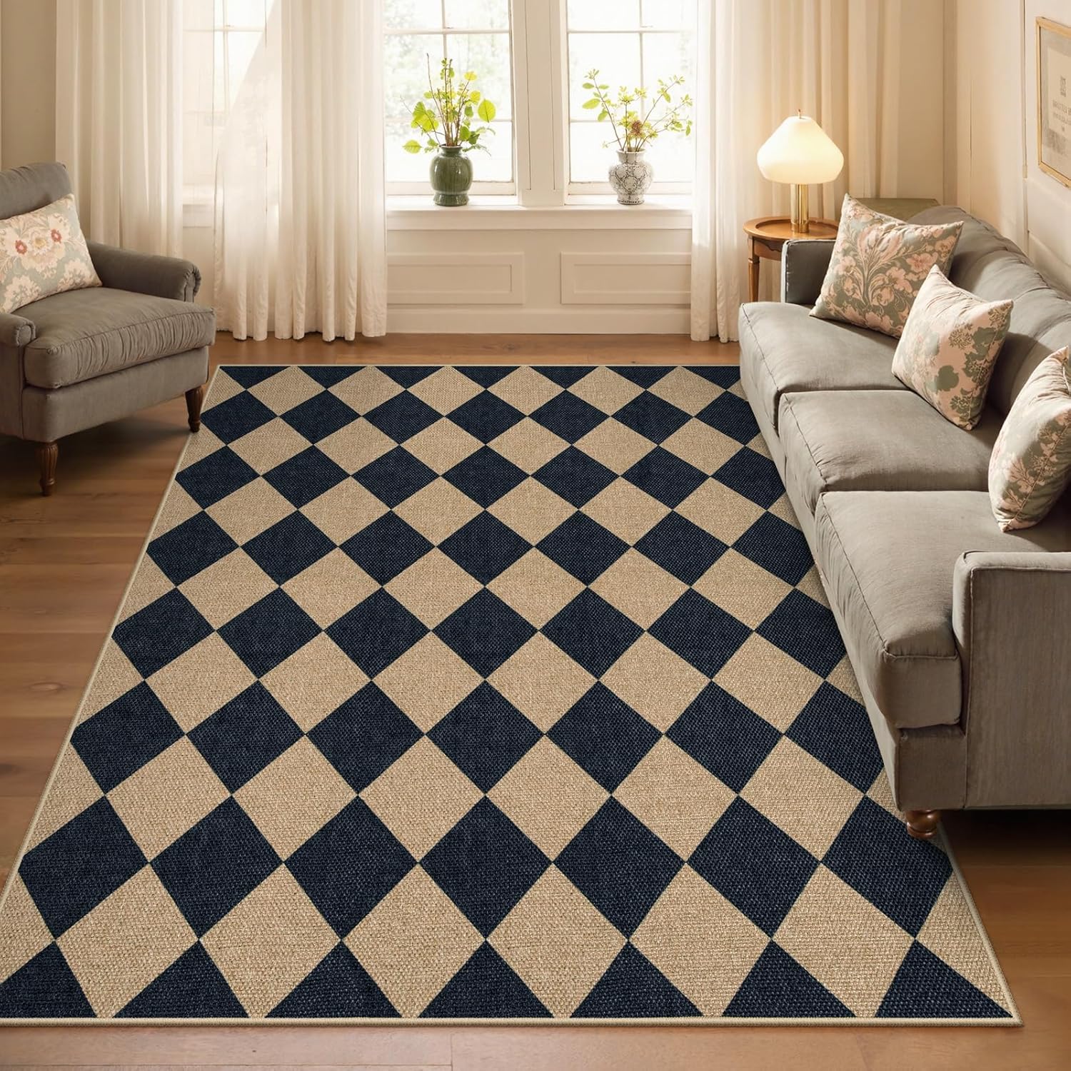 Lahome Checkered Easy Jute 5x7 Area Rugs, Washable Outdoor Patio Rug for Living Room Diamond Indoor Outdoor Carpet, Farmhouse Geometric Non Slip Black Carpet for Backyard Dining Room