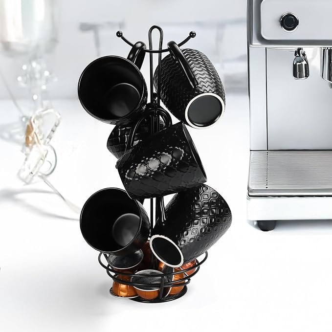 • Fashionable Appearance: Each coffee mug features a stylish matte black design and an unique embossed pattern on the outside, giving it an elegant and classic look. It is perfect for hot and cold beverages, coffee, milk, tea, etc.