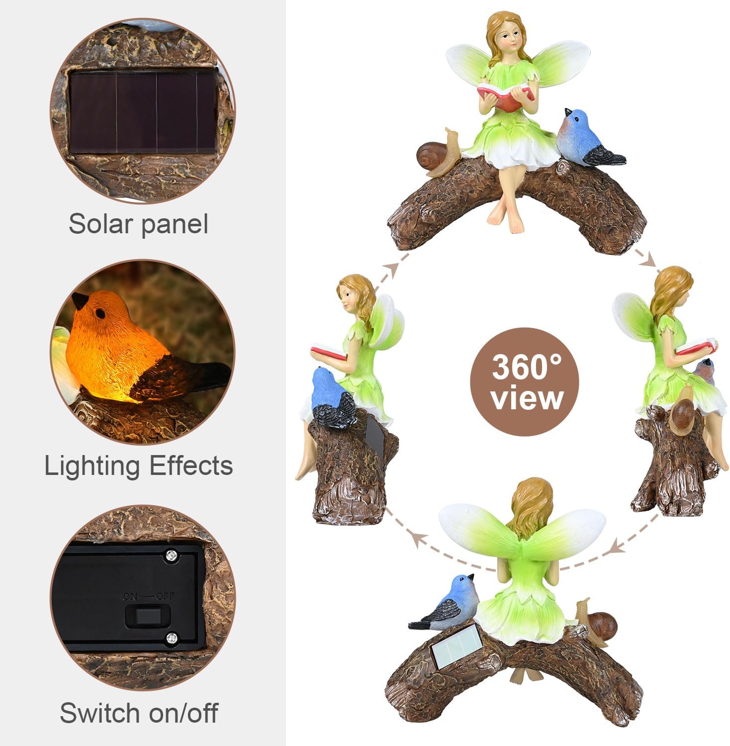 • 【AUTO-ON SOLAR DECORATION】This solar flower fairy figurine is very easy to install and use. Simply turn on the switch and place it under the sunlight and let the solar panel will charge within 5-8 hours during the day and light up automatically at night for 8-10 hours.bird and snails figurine glow at night