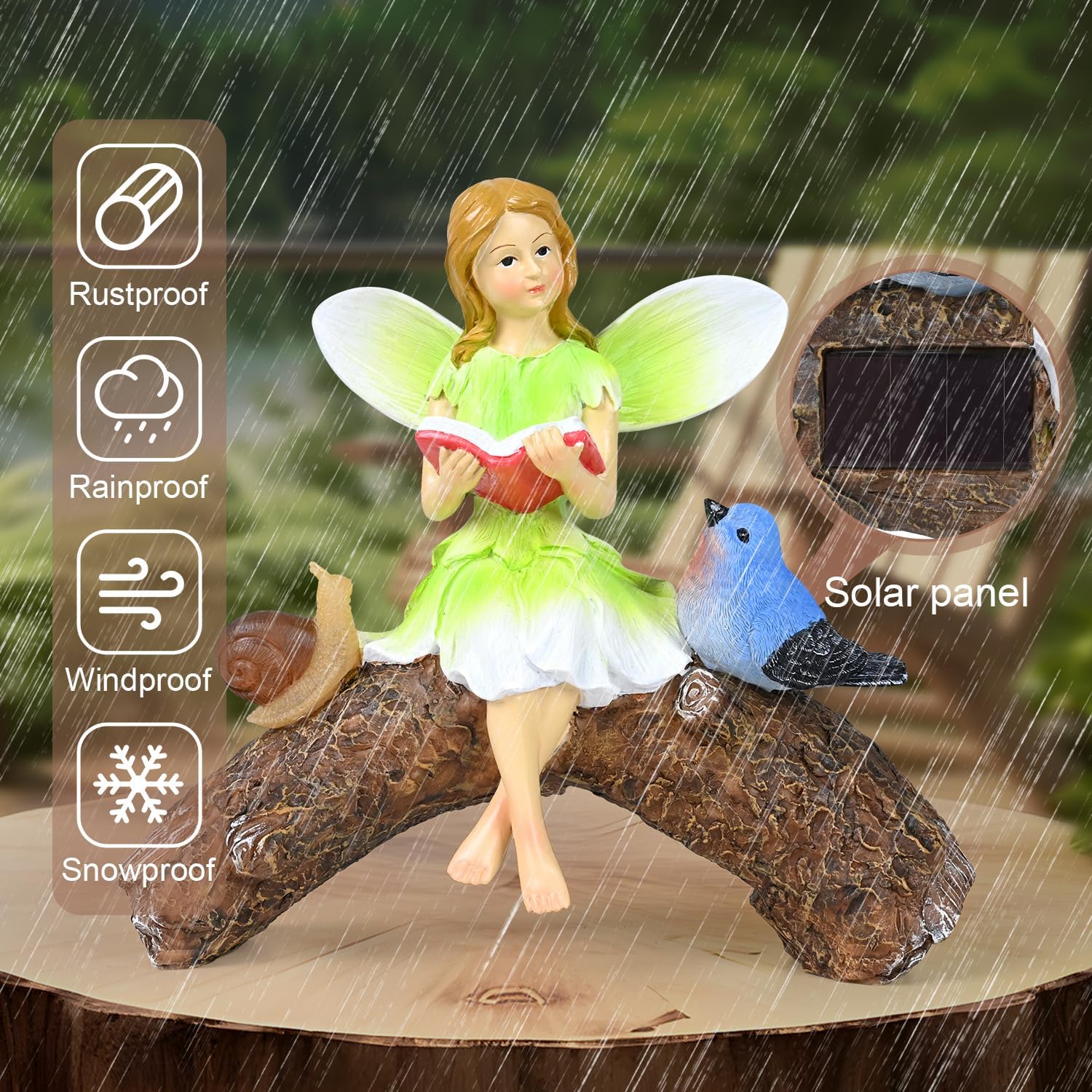 • 【BEAUTIFUL FAIRY STATUE】Yiosax garden flower fairy statue outdoor decor,features beautiful crafted details and vibrant colors,This green flower fairy statue and her two little companions, snails and birds, sat on a wooden stake reading a book,adding a lot of happy and hope to your garden,patio,backyard,lawn,window sills,flower bed