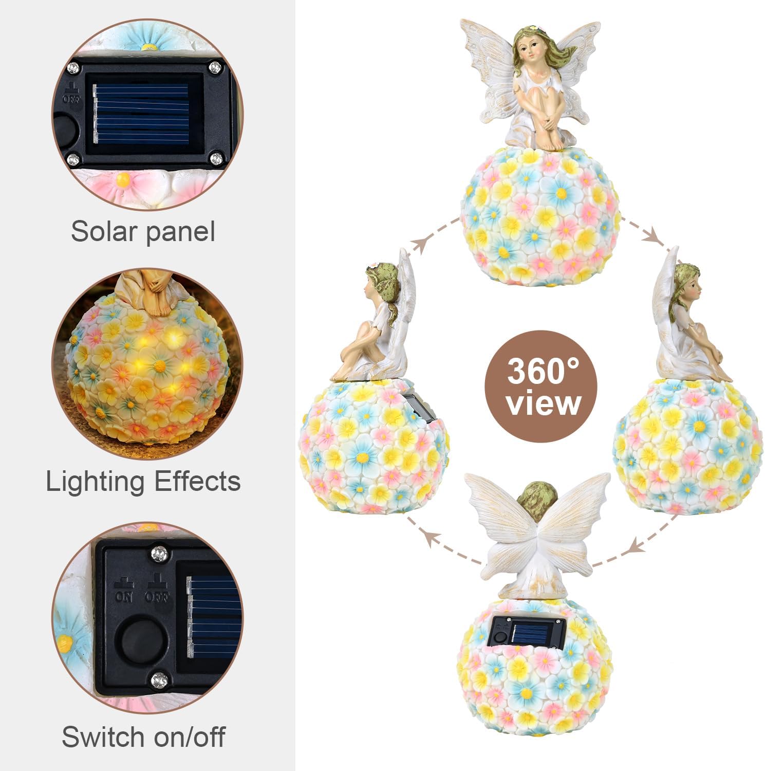 • 【AUTO-ON SOLAR DECORATION】This solar flower fairy figurine is very easy to install and use. Simply turn on the switch and place it under the sunlight and let the solar panel will charge within 5-8 hours during the day and light up automatically at night for 6-8 hours.Note: This Flower Fairy is solar charged